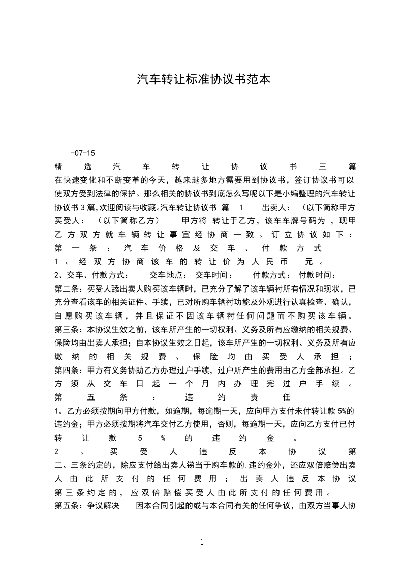 在快速变化和不断变革的今天,越来越多地方需要用到协议书,签订协议书可以使双方受到法律的保护。那么相关的协议书到底怎么写呢以下是小编整理的汽车转让协议书3篇,欢迎阅读与收藏。汽车转让协议书 篇1 出卖人: (以下简称甲方) 买受人: (以下简称乙方) 甲方将 转让于乙方,该车车牌号码为 ,现甲乙方双方就车辆转让事宜经协商一致。订立协议如下: