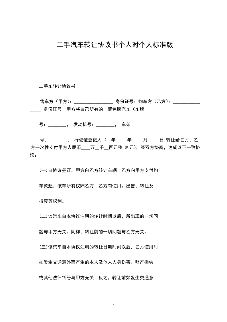 第七条:合同效力 本合同经买卖双方签字(或签章)后生效。 出卖人签字(签章): 买受人签字(签章): 电话: 电话:________年____月____日________年____月____日汽车转让协议书 篇2 甲方: 身份证号码: 住址: 乙方: 身份证号码: 住址: —183;为了维护双方共同利益,做到公平交易,现甲方将 转让给乙方,发动机号码为: ,转让价格人民币(大写) 整,(小写) ,由乙方即日起分一个月内将购车款付清给甲方,后乙方应协助甲方办理过户手续。 二.甲方应提供此车一切正常手续,如:行车证、车辆登记证书、车辆购置证书、税证、二手交易发票、保险单、身份证复印件,如果乙方发现甲方所提供的证件是假的或是套牌车,一切后果由甲方负责。 三.甲、乙双方同时声明该车在________年____月____日 时 以前发生的一切交通事故,经济纠纷,法律责任,由原车主负责。在________年____月____日 时 以后发生的一切交通事故,经济纠纷,法律责任,维修费用,由新车主负责。 甲方(公章):_________