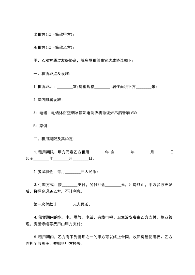 2、房屋租金:每月__________元。按月付款,每月提前______天付款。另付押金_________元,共计____________元.