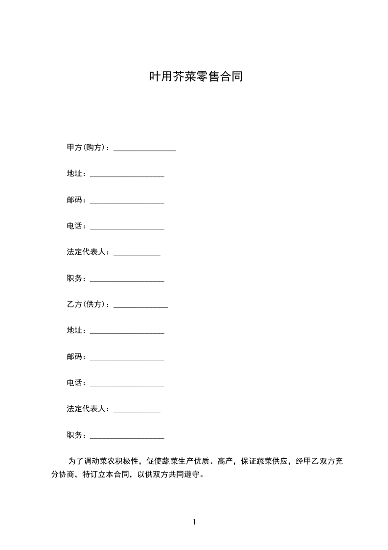 第十条其他约定________________________________________________________.(本合同自甲乙双方签字之日起生效,甲乙双方任何一方不得擅自修改或解除合同,如双方代表人发生变更,不得变更合同。本合同内如有未尽事宜,必须由甲乙双方共同协商,作出补充规定,补充规定与本合同具有同等效力。合同期满,甲乙双方可根据对下________年蔬菜供求的预测,重新签订蔬菜订购合同。)