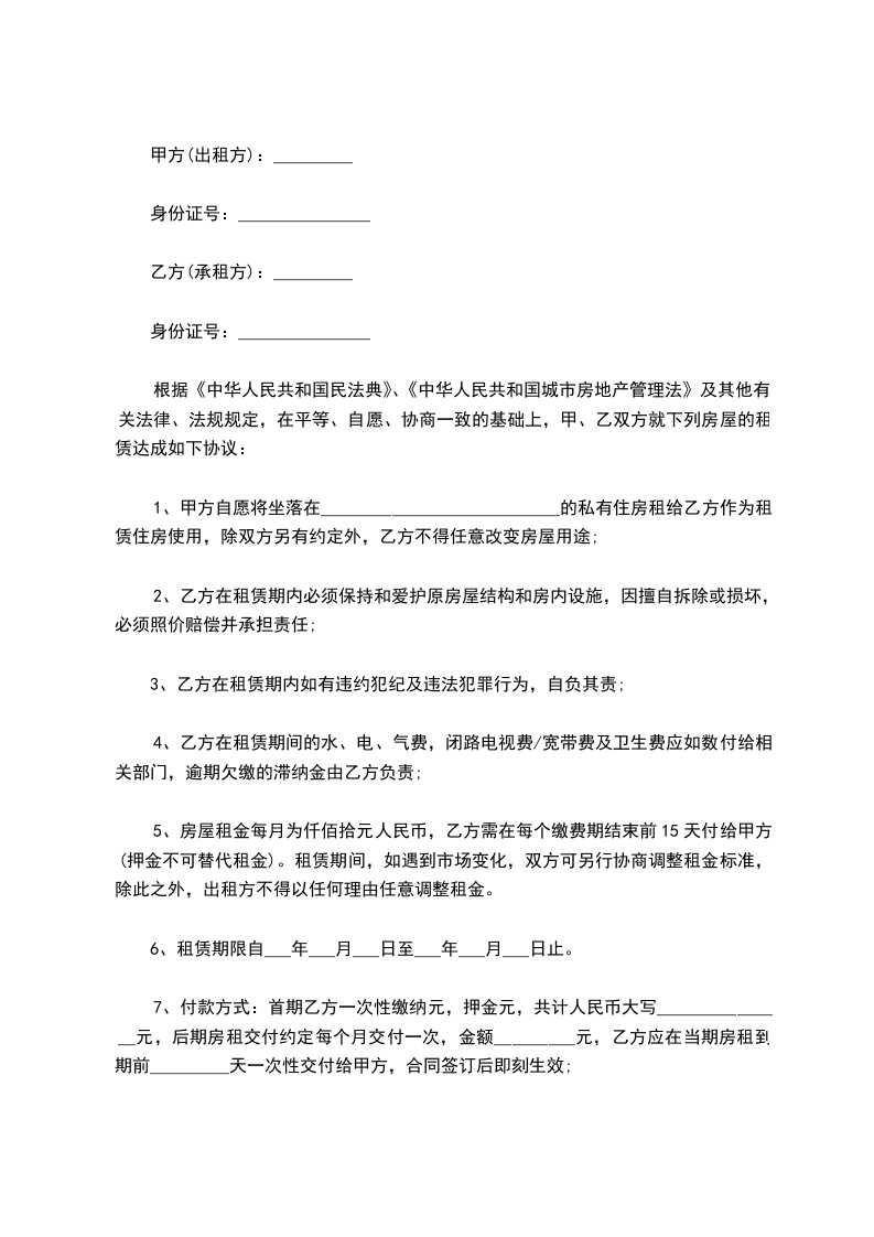 1、甲方自愿将坐落在___________________________的私有住房租给乙方作为租赁住房使用,除双方另有约定外,乙方不得任意改变房屋用途;
