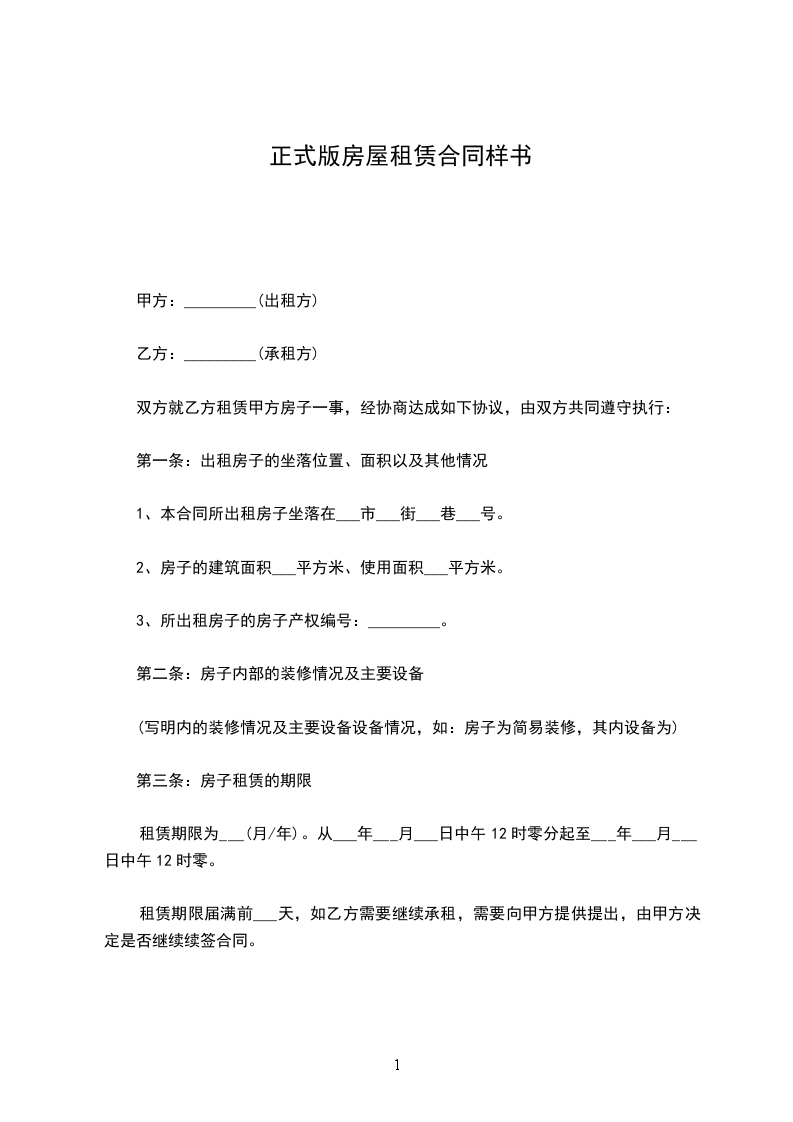 二、该房出租的使用性质为_________用房,月租金为_________元,缴租方式为_________支付一次,计人民币(大写)_________元(¥_________元),以后就在付款期末前_________天支付。
