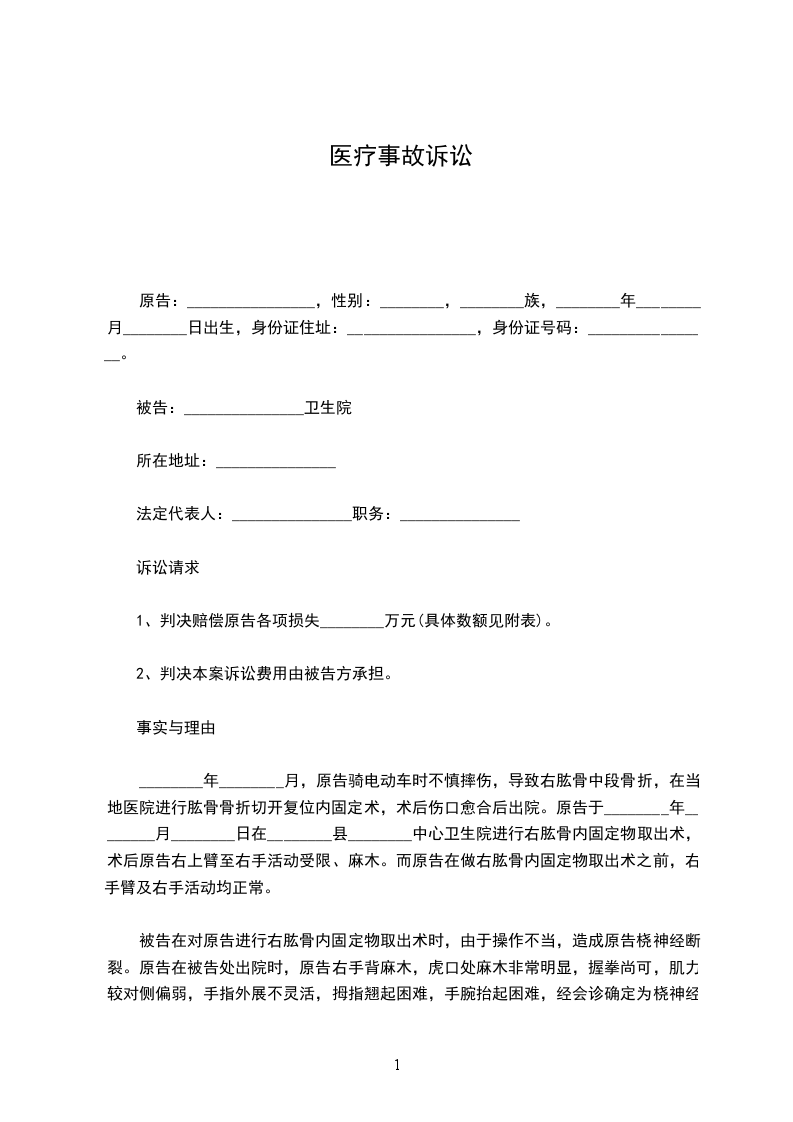 _年________月,原告骑电动车时不慎摔伤,导致右肱骨中段骨折,在当地医院进行肱骨骨折切开复位内固定术,术后伤口愈合后出院。原告 ________年________月__________________日 在________县________中心卫生院进行右肱骨内固定物取出术,术后原告右上臂至右手活动受限、麻木。而原告在做右肱骨内固定物取出术之前,右手臂及右手活动均正常。