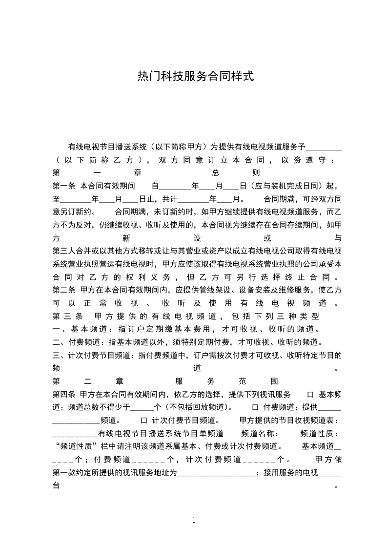 有线电视节目播送系统(以下简称甲方)为提供有线电视频道服务予_________(以下简称乙方),双方同意订立本合同,以资遵守: