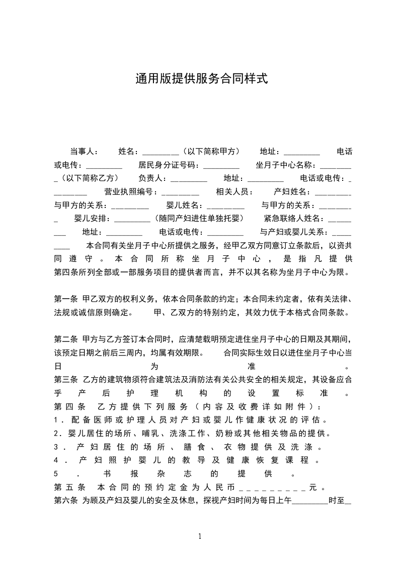 当事人: 姓名:_________(以下简称甲方) 地址:_________ 电话或电传:_________ 居民身分证号码:_________ 坐月子中心名称:_________(以下简称乙方) 负责人:_________ 地址:_________ 电话或电传:_________ 营业执照编号:_________ 相关人员: 产妇姓名:_________ 与甲方的关系:_________ 婴儿姓名:_________ 与甲方的关系:_________ 婴儿安排:_________(随同产妇进住单独托婴) 紧急联络人姓名:_________ 地址:_________ 电话或电传:_________ 与产妇或婴儿关系:_________ 本合同有关坐月子中心所提供之服务,经甲乙双方同意订立条款后,以资共同遵守。本合同所称坐月子中心,是指凡提供