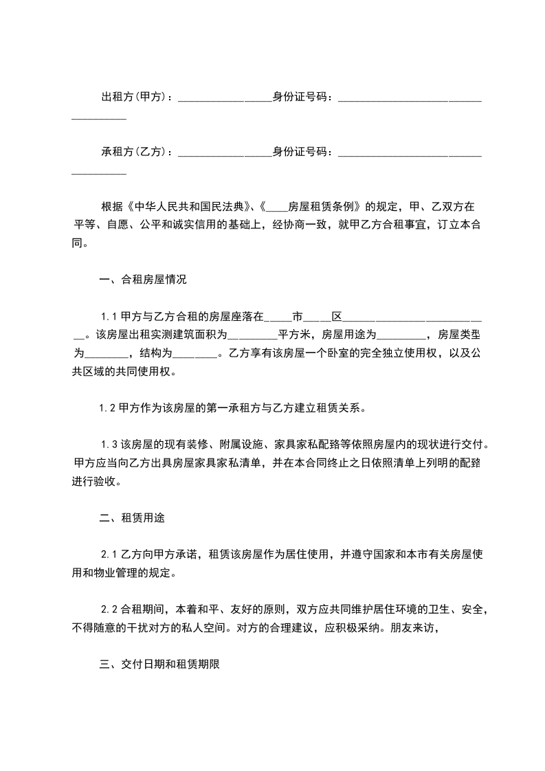 1.1甲方与乙方合租的房屋座落在_____市_____区___________________________。该房屋出租实测建筑面积为_________平方米,房屋用途为_________,房屋类型为________,结构为________。乙方享有该房屋一个卧室的完全独立使用权,以及公共区域的共同使用权。