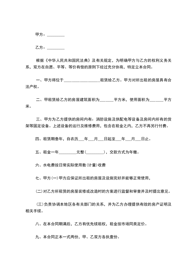 五、租金一年_________元整(_________),交款方式为年缴。
