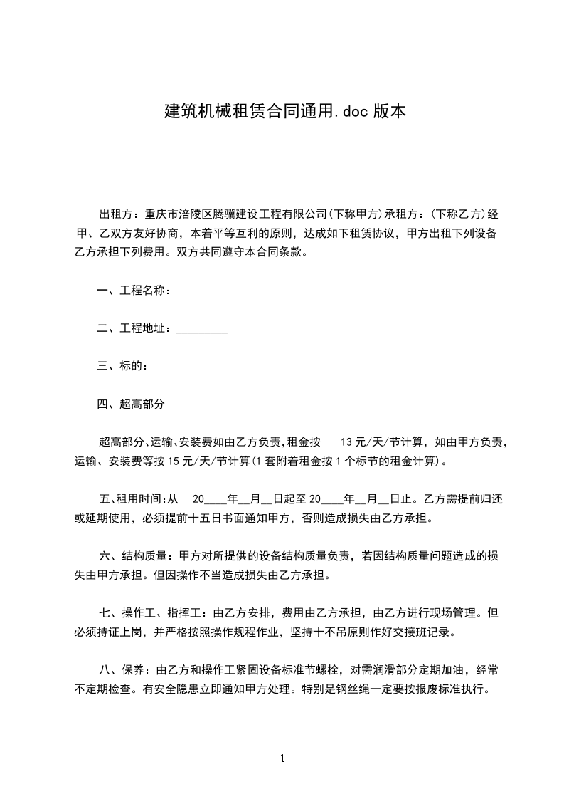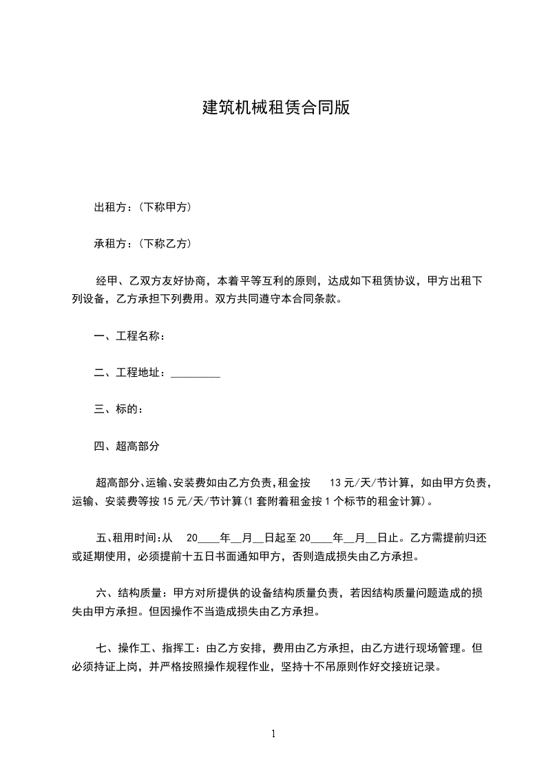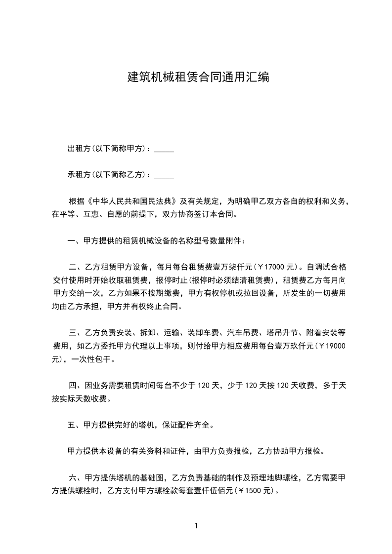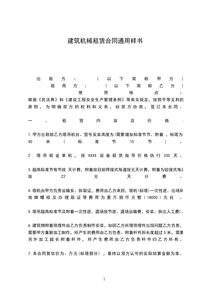 1.甲方出租给乙方塔吊机台、型号安装高度为(需要增加标准节节、附着 ,标塔为40米(标准节15节)。
