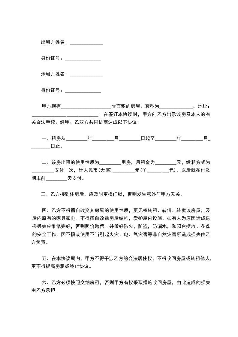 二、该房出租的使用性质为_________用房,月租金为_________元,缴租方式为_________支付一次,计人民币(大写)_________元(¥_________元),以后就在付款期末前_________天支付。