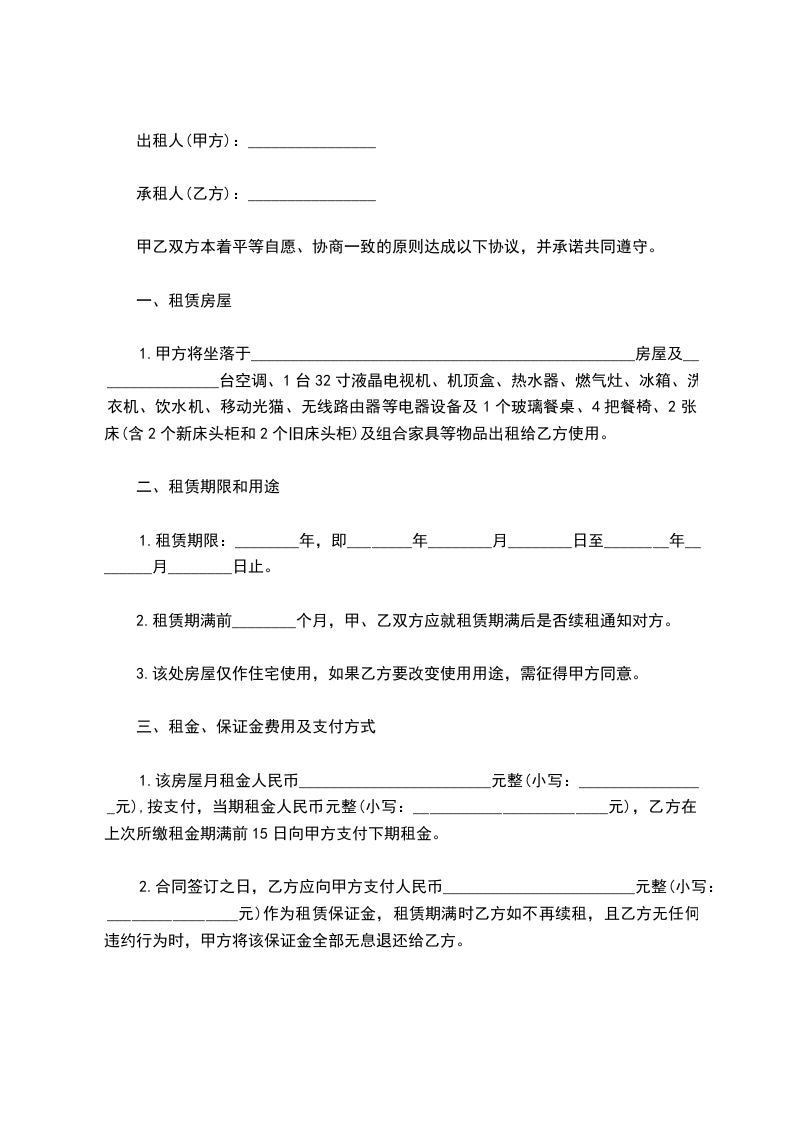 1、租赁期限为_____年,自_____年_____月_____日至_____年_____月_____日止。合同期满前_____个月,乙方如续租,双方另行签订合同。在同等条件,乙方有优先租赁权。