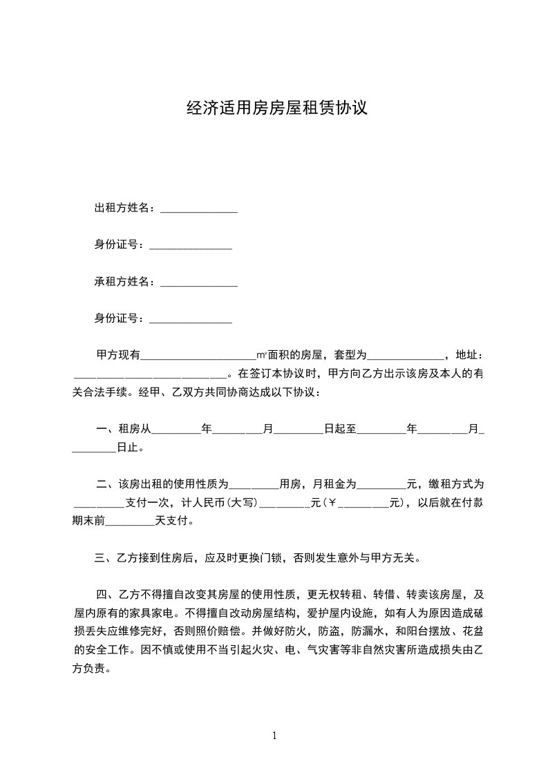 二、该房出租的使用性质为_________用房,月租金为_________元,缴租方式为_________支付一次,计人民币(大写)_________元(¥_________元),以后就在付款期末前_________天支付。