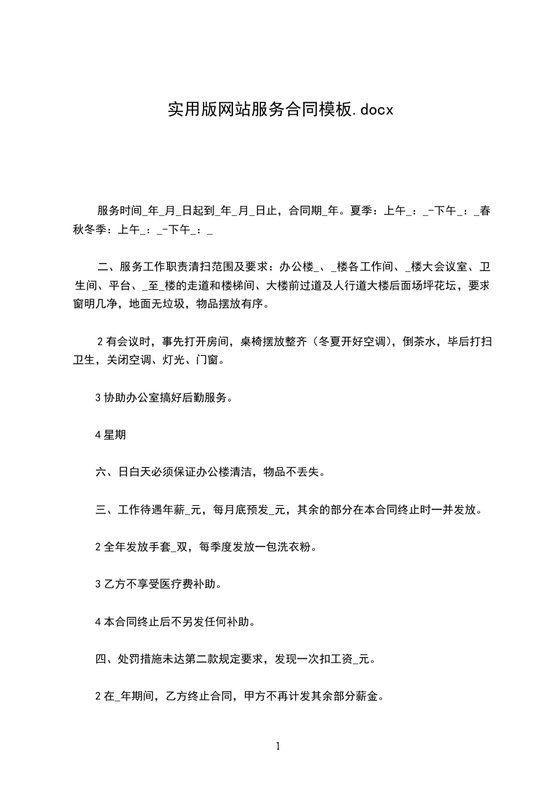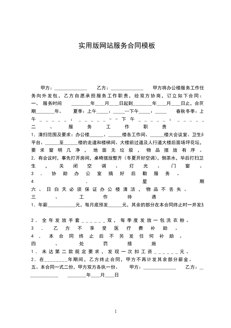 一、 服务时间 ________年____月____日起到________年____月____日止,合同期________年。 夏季:上午_____:_____--下午_____:_____ 春秋冬季:上午_____:_____--下午_____:_____