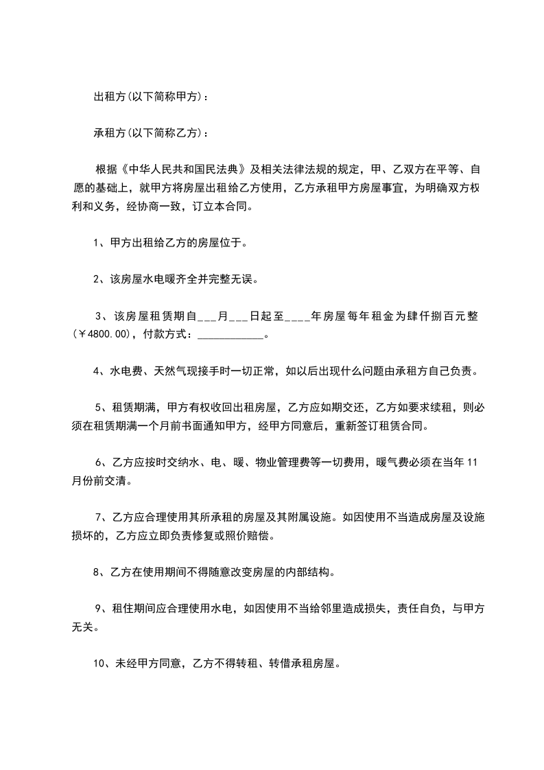 10、未经甲方同意,乙方不得转租、转借承租房屋。
