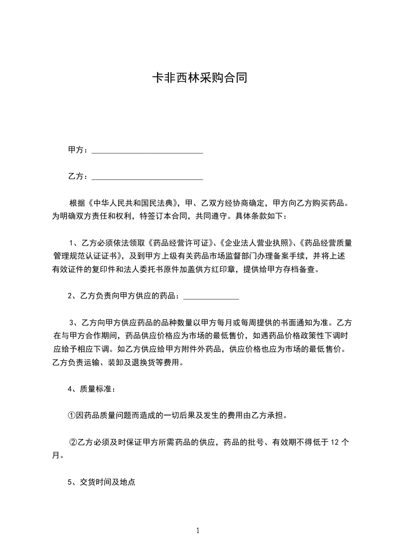 根据《中华人民共和国民法典》,甲、乙双方经协商确定,甲方向乙方购买药品。为明确双方责任和权利,特签订本合同,共同遵守。具体条款如下: