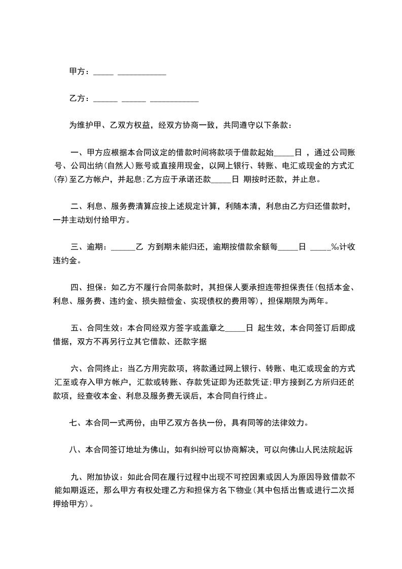 九、附加协议:如此合同在履行过程中出现不可控因素或因人为原因导致借款不能如期返还,那么甲方有权处理乙方和担保方名下物业(其中包括出售或进行二次抵押给甲方)。
