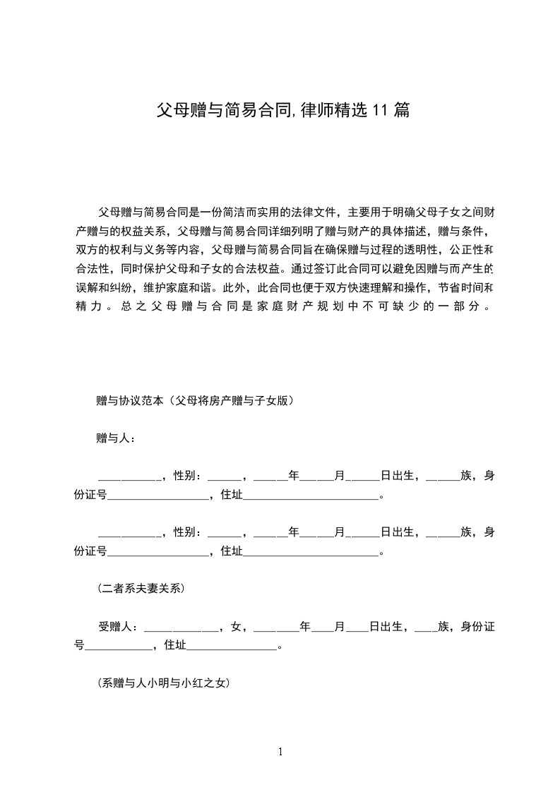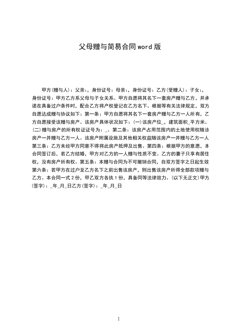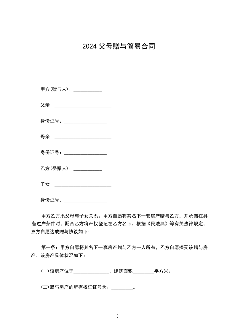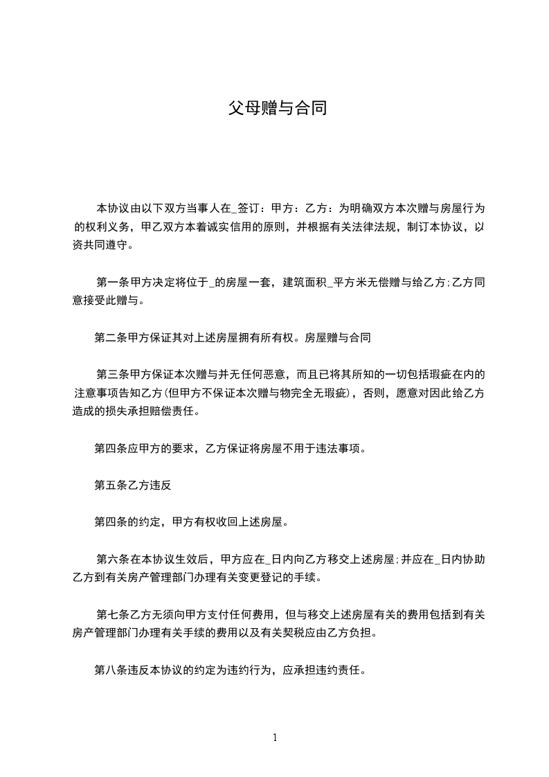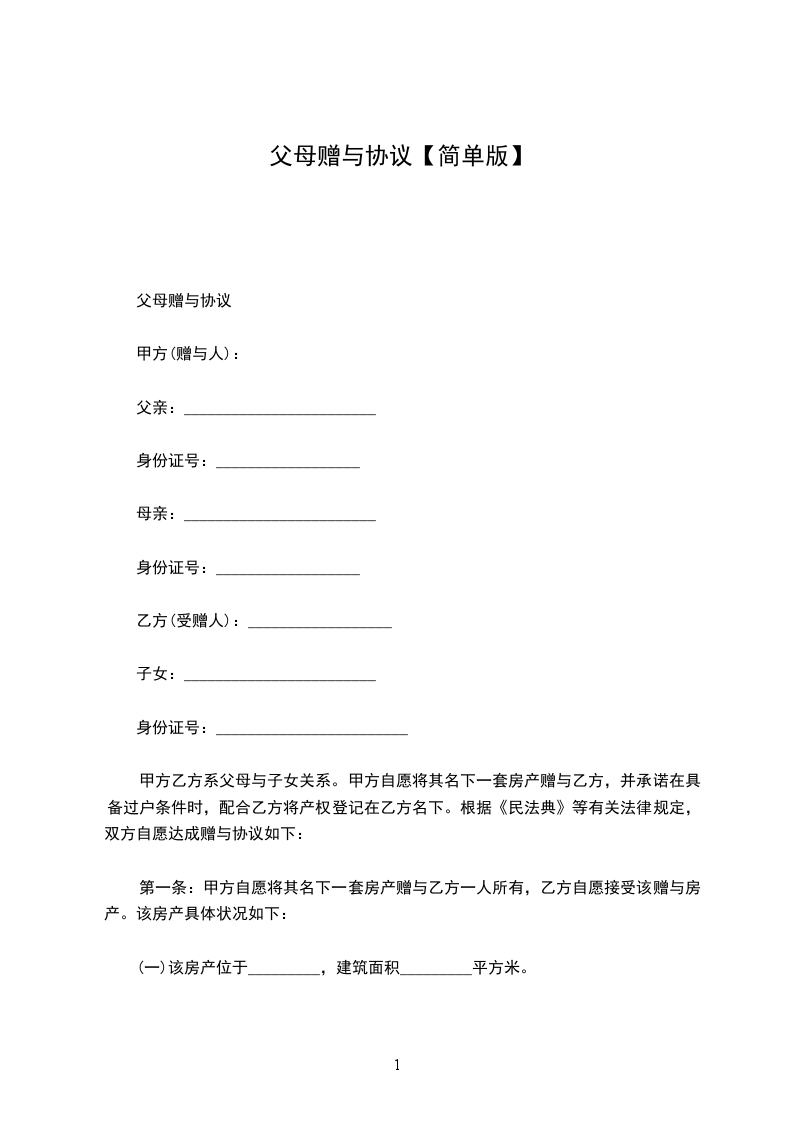 甲方乙方系父母与子女关系。甲方自愿将其名下一套房产赠与乙方,并承诺在具备过户条件时,配合乙方将产权登记在乙方名下。根据《民法典》等有关法律规定,双方自愿达成赠与协议如下: