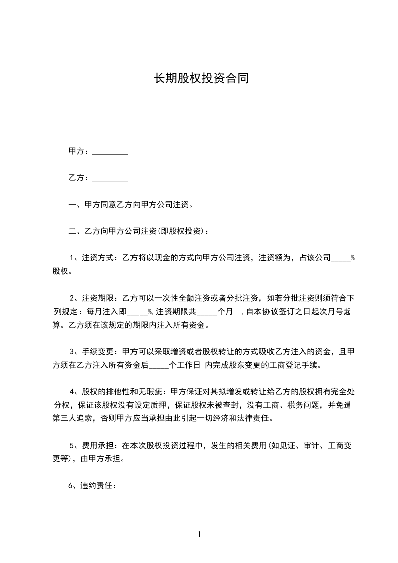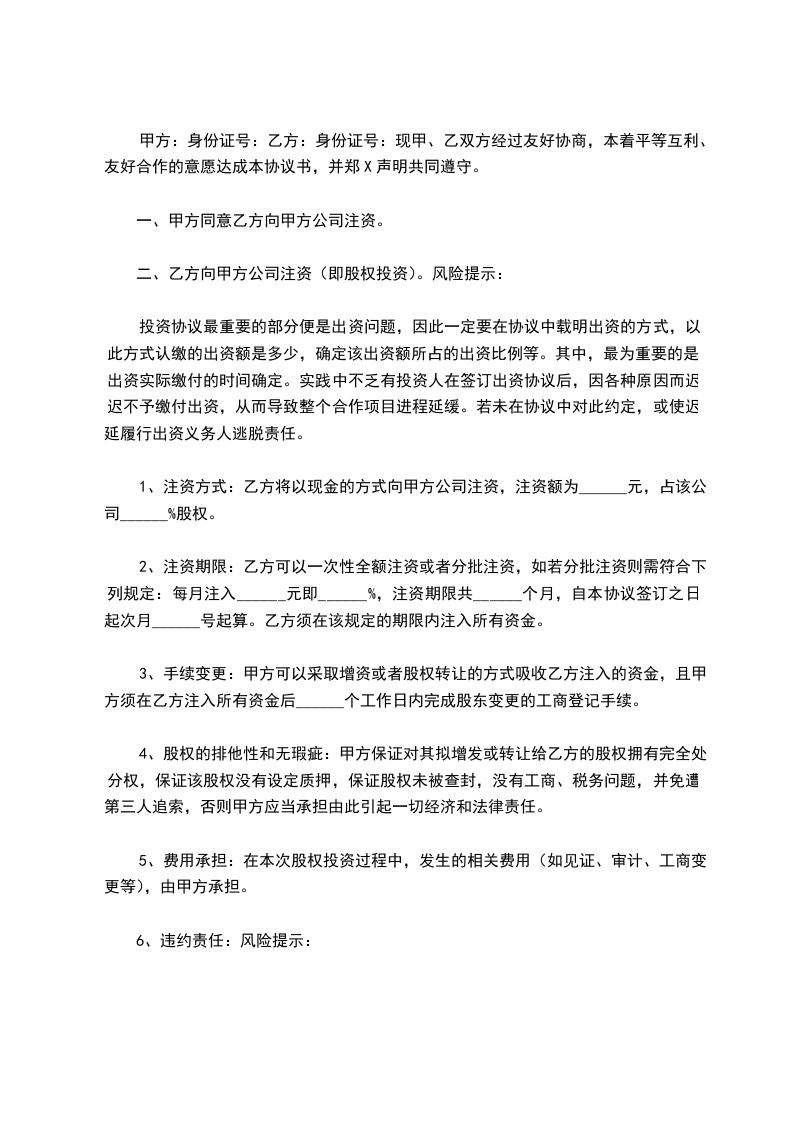 1、注资方式:乙方将以现金的方式向甲方公司注资,注资额为______元,占该公司______%股权。