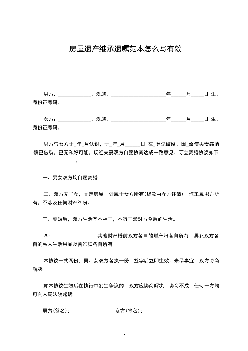 (一)我自愿将下列归我所有的财产遗留给甲(应当是法定继承人之一):_________________(是房产的,写明权属证书号及房产地址、面积等详情;是其他财产的,写明财产详情。)