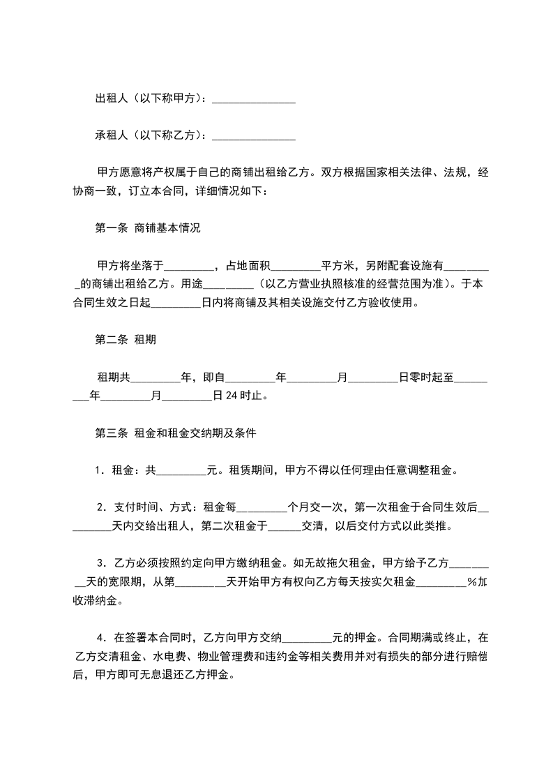 甲方将坐落于_________,占地面积_________平方米,另附配套设施有_________的商铺出租给乙方。用途_________(以乙方营业执照核准的经营范围为准)。于本合同生效之日起_________日内将商铺及其相关设施交付乙方验收使用。
