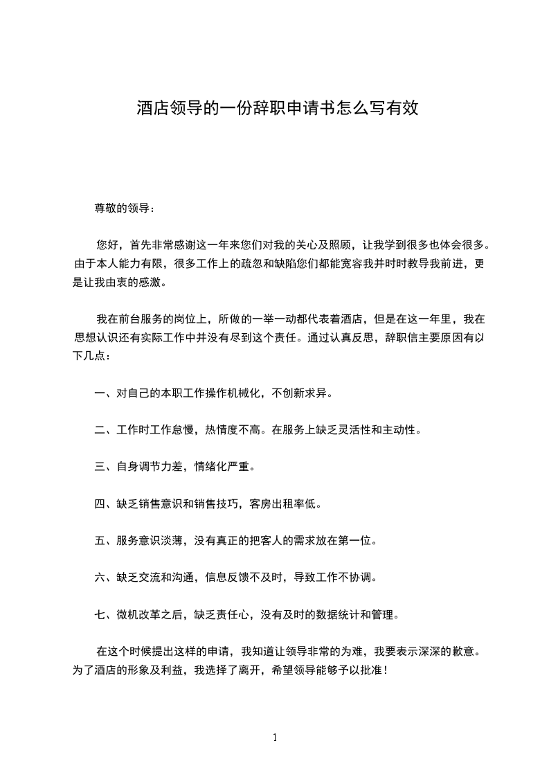 在这个时候提出这样的申请,我知道让领导非常的为难,我要表示深深的歉意。为了酒店的形象及利益,我选择了离开,希望领导能够予以批准!