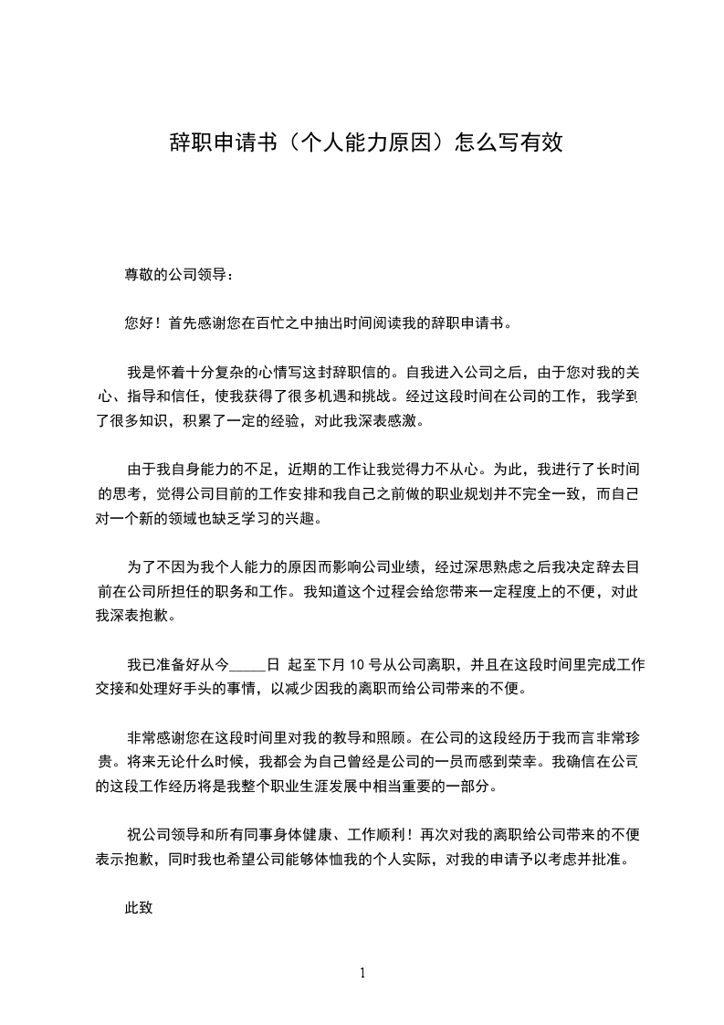 为了不因为我个人能力的原因而影响公司业绩,经过深思熟虑之后我决定辞去目前在公司所担任的职务和工作。我知道这个过程会给您带来一定程度上的不便,对此我深表抱歉。