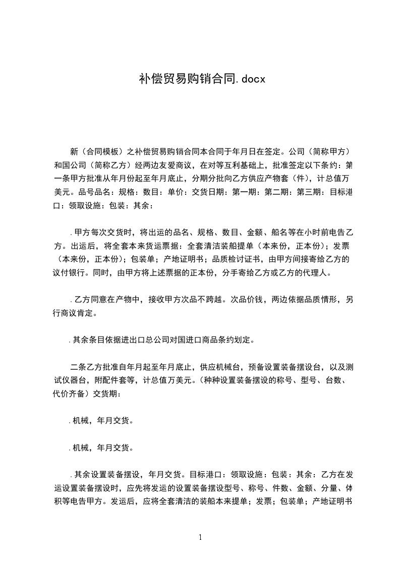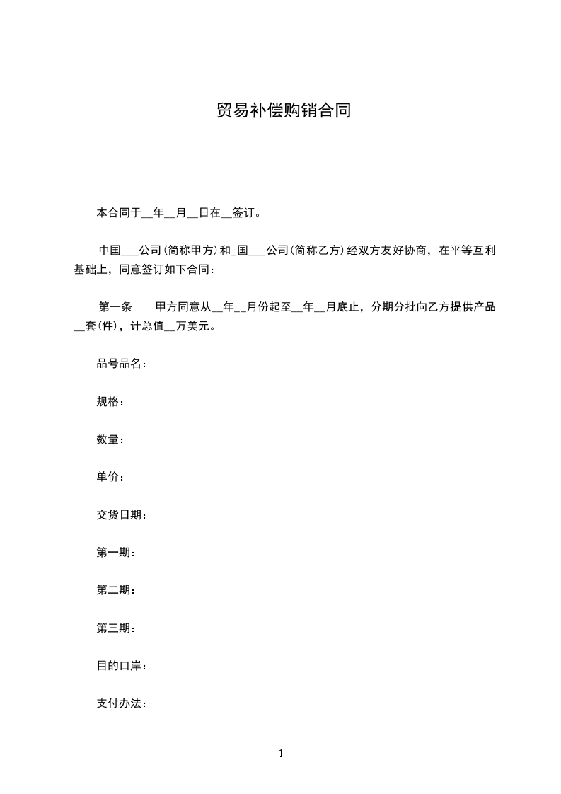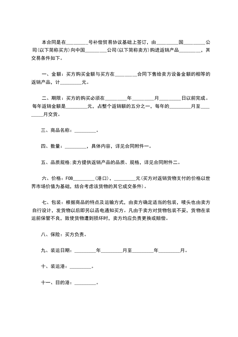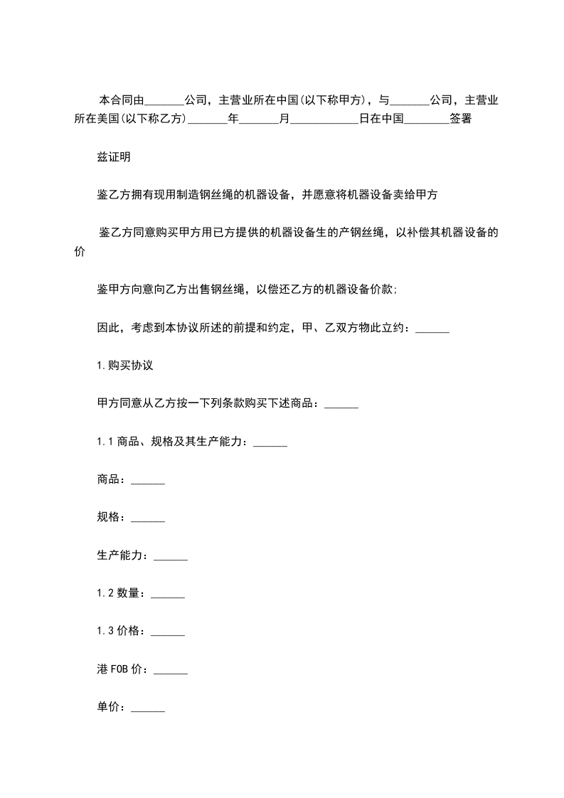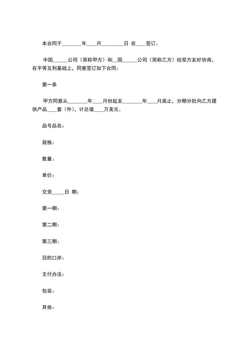 第一条甲方同意从 ___________年_____月 份起至 ___________年_____月 底止,分期分批向乙方提供产品 套(件),计总值 万美元。
