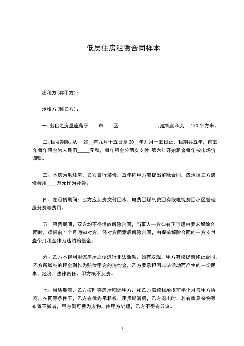 三、本房为毛坯房,乙方自行装修,五年内甲方若提出解除合同,应承担乙方装修费用____万元作为补尝。