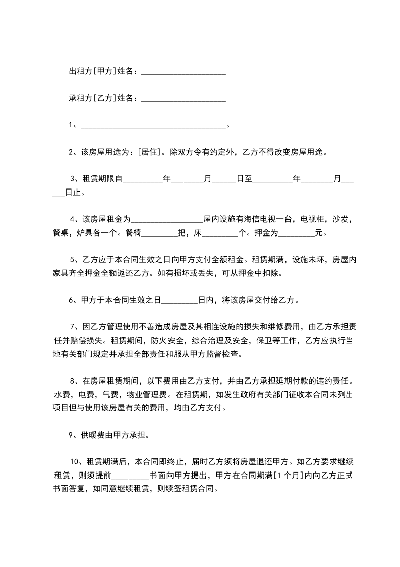 4、该房屋租金为__________________屋内设施有海信电视一台,电视柜,沙发,餐桌,炉具各一个。餐椅_________把,床_________个。押金为_________元。