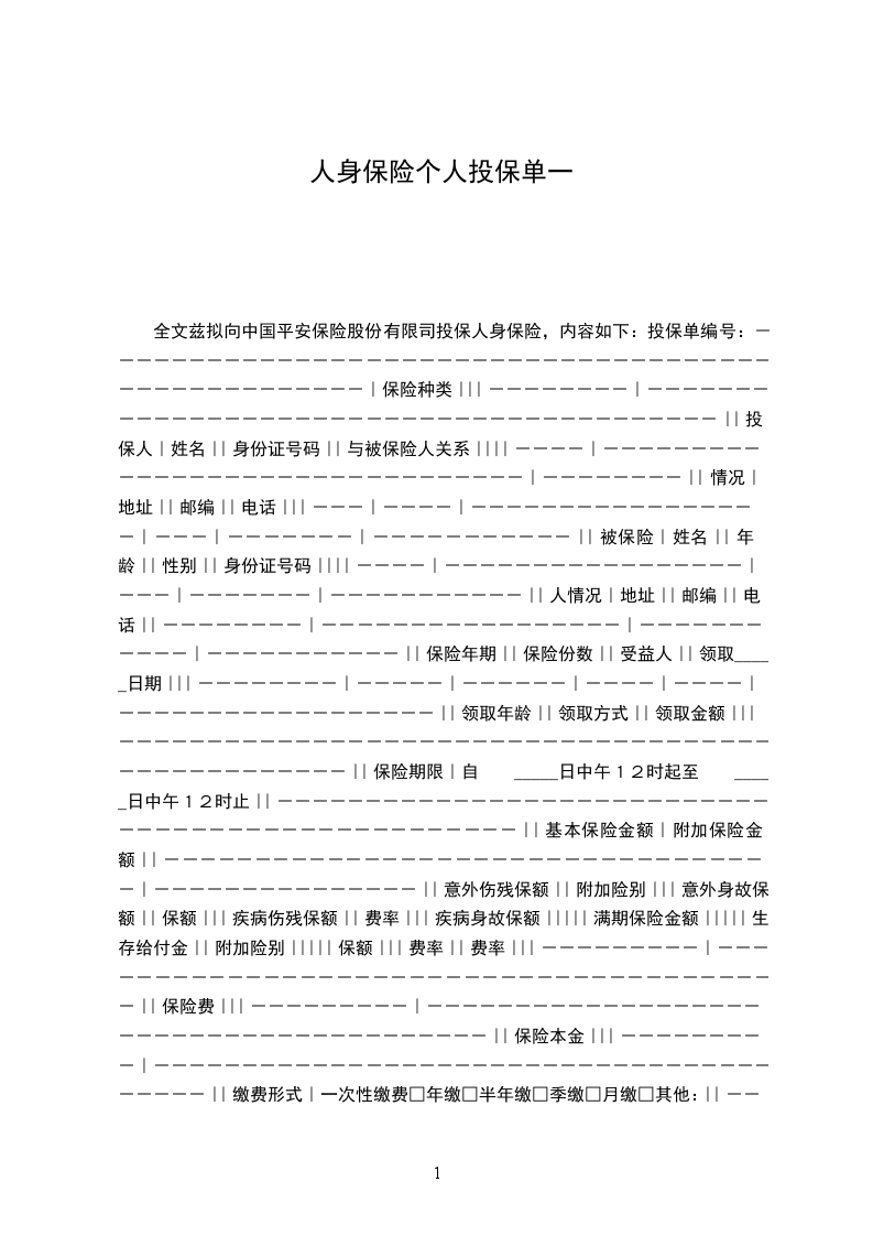 全文兹拟向中国平安保险股份有限司投保人身保险,内容如下:投保单编号:----------------------------------------------------|保险种类|||--------|-----------------------------------------||投保人|姓名||身份证号码||与被保险人关系||||----|--------------------------------|--------||情况|地址||邮编||电话|||---|----|-----------------|---|-------|-----------||被保险|姓名||年龄||性别||身份证号码||||----|-----------------|---|-------|-----------||人情况|地址||邮编||电话||--------|-----------------|-----------|-----------||保险年期||保险份数||受益人||领取_____日期|||--------|-----|------|----|----|------------------||领取年龄||领取方式||领取金额|||--------------------------------------------------||保险期限|自 _____日中午12时起至 _____日中午12时止||--------------------------------------------------||基本保险金额|附加保险金额||----------------------------------|---------------||意外伤残保额||附加险别|||意外身故保额||保额|||疾病伤残保额||费率|||疾病身故保额|||||满期保险金额|||||生存给付金||附加险别|||||保额|||费率||费率|||---------|----------------------------------------||保险费|||---------|----------------------------------------||保险本金|||---------|----------------------------------------||缴费形式|一次性缴费□年缴□半年缴□季缴□月缴□其他:||---------|----------------------------------------||付款方式||币种|||---------|------------------------|------|--------||开户银行||帐号||-------------------------------------------------------------------------------------------------------|特别约定:||||||||-------------------------------------------------||被保险人健康状况:||1.目前尚在病假中□有□无||2.因病休或因病减轻劳动量□有□无||3.因患有其他慢性病而不能全勤工作或经常缺勤□有□无||4.有无严重病史□有□无||5.癌症、肝硬化、癫痫病、脑震荡、精神病、心脏病、高血压病、血管硬化、性病等□有□无||||投保人是否健康□是□否||||-------------------------------------------------||投保声明:||1)本投保单所填写的各项内容,均属真实,可作为你公司签发保单的根据,并成为双方合约的组||成部分,如_____日后发现与事实不符,即使保单签发,你公司仍可不负任何责任。||2)本投保单方格内填列√者,即作为本投保人“同意”或“是”的答复。||3)保户在投保时应填具确实年龄,保户年龄计算以身份证为根据,计算办法以保户在起保_____日最||后一个生_____日时的足岁年龄计算,如误将年龄报小,应随时申请更正,并补缴保费及其利息,否则在发||生给付时,其应得利益当按保户所付保费与实际年龄应付保费之比例计算。||||投保人 (签章):______ _____日|||---------------------------------------------------(以下由保险公司填写)--------------------------------------------|审核意见:||||||审核人 (签章):______公司章||||------------------------------------------||保险单号码:签单人代码:签单 _____日期:____ _____日|------------------------------------------