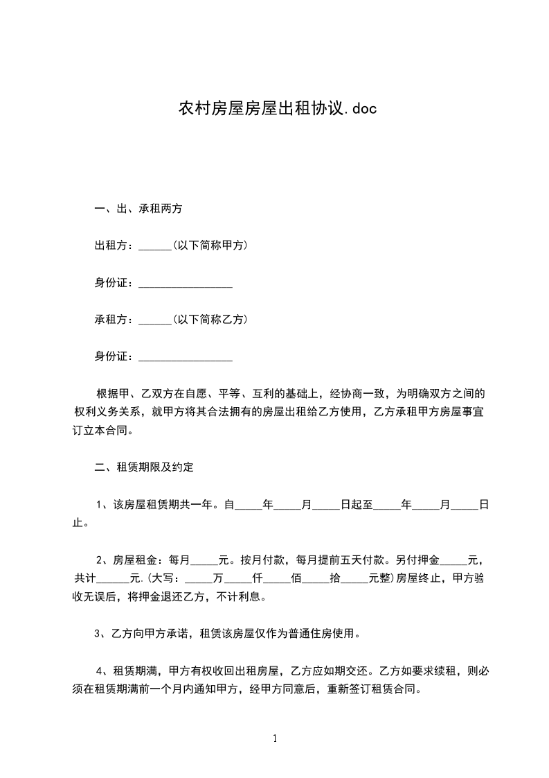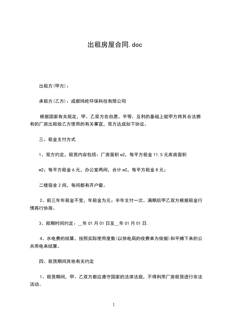 一、甲方同意乙方承租位于___________________,面积:_________平方米,每月房租______________元,用于从事住宿。