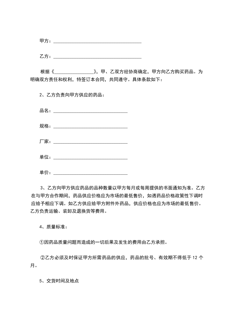 根据《_________________》,甲、乙双方经协商确定,甲方向乙方购买药品。为明确双方责任和权利,特签订本合同,共同遵守。具体条款如下: