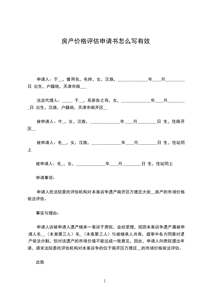 申请人诉被申请人遗产继承一案诉于贵院,业经受理,现因本案诉争遗产属被申请人毛__(本案第三人)毛_(本案第三人)与被继承人共有,庭审中各方同意对遗产依法分割,但对该遗产的市场价值不能达成一致意见,因此,申请人向贵院提出申请,请求法院委托评估机构对本案诉争的位于南开区万德庄__的市场价格依法评估。