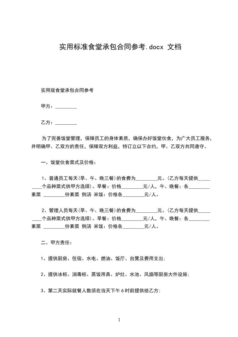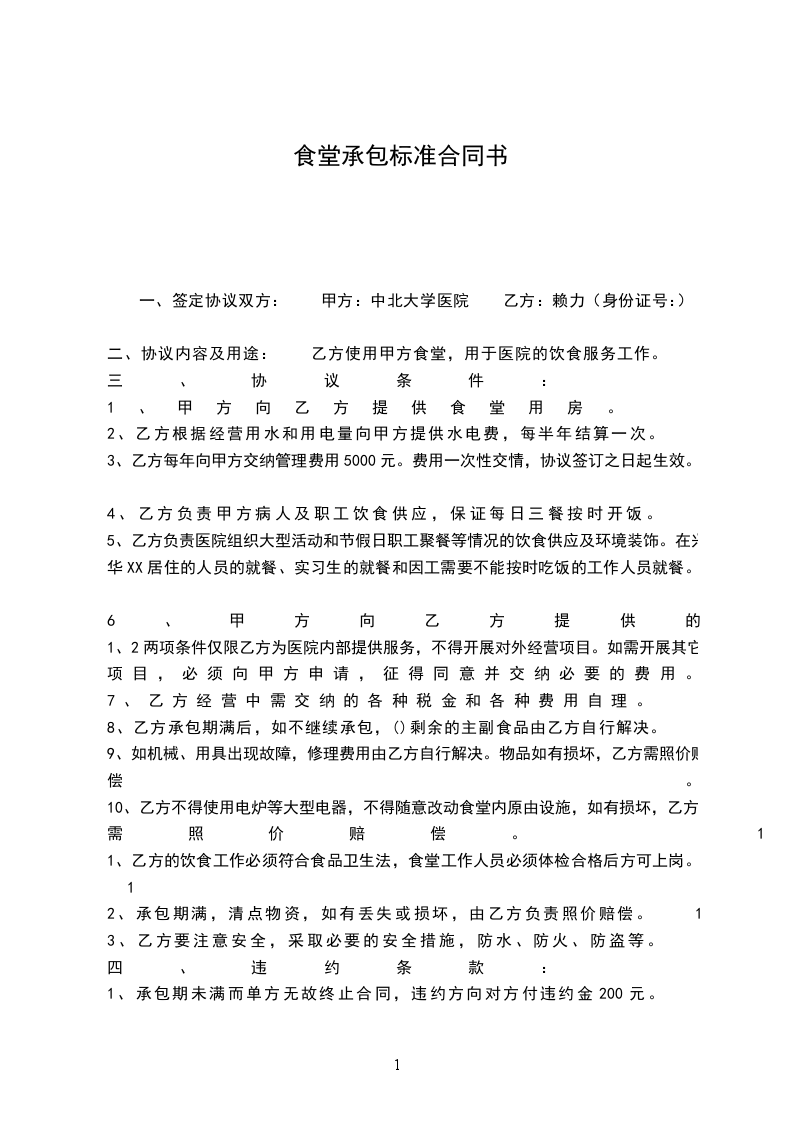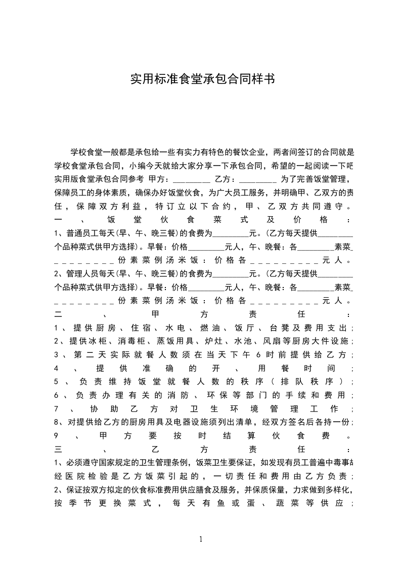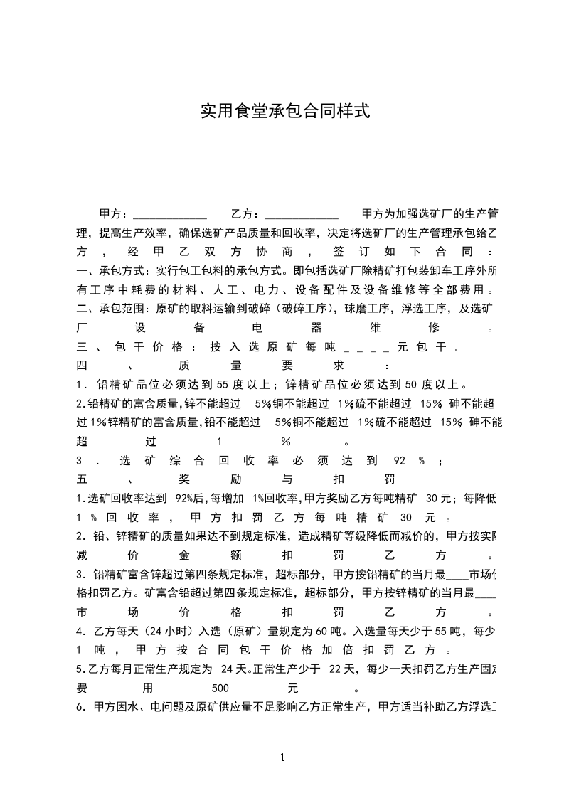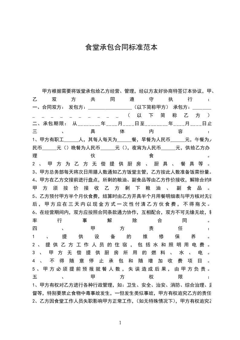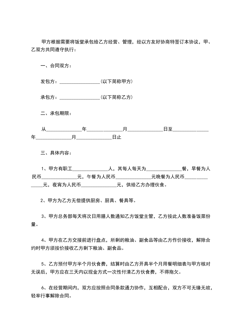 一、承包范围和期限。 甲方同意将学校食堂发包给乙方经营。承包期限为________年即:________年____月____日至________年1____月____日。