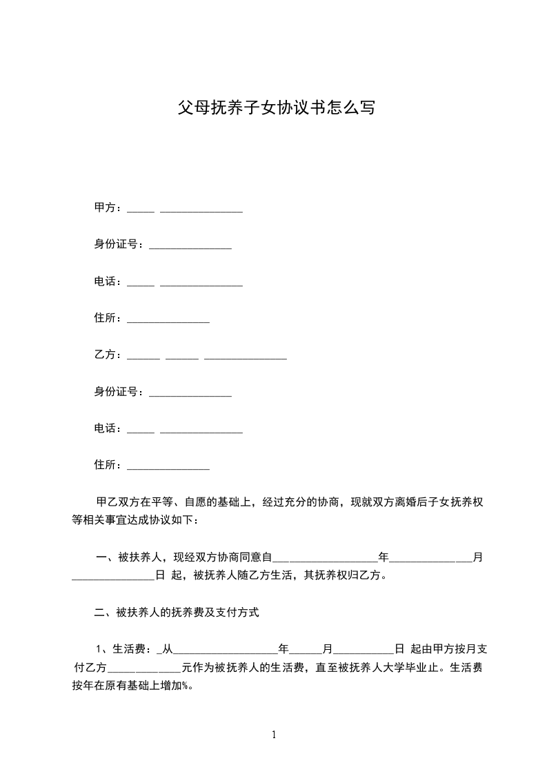 1、生活费:_从___________________年______月___________日 起由甲方按月支付乙方_____________元作为被抚养人的生活费,直至被抚养人大学毕业止。生活费按年在原有基础上增加%。