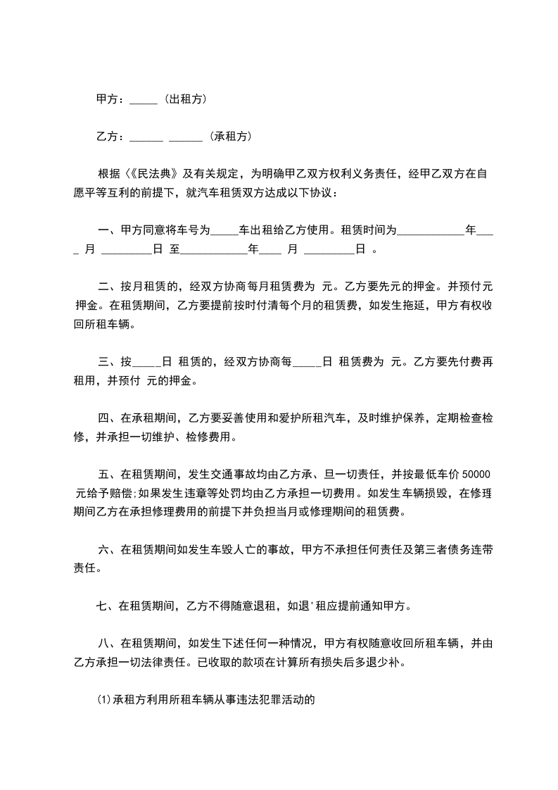 根据〈《民法典》及有关规定,为明确甲乙双方权利义务责任,经甲乙双方在自愿平等互利的前提下,就汽车租赁双方达成以下协议: