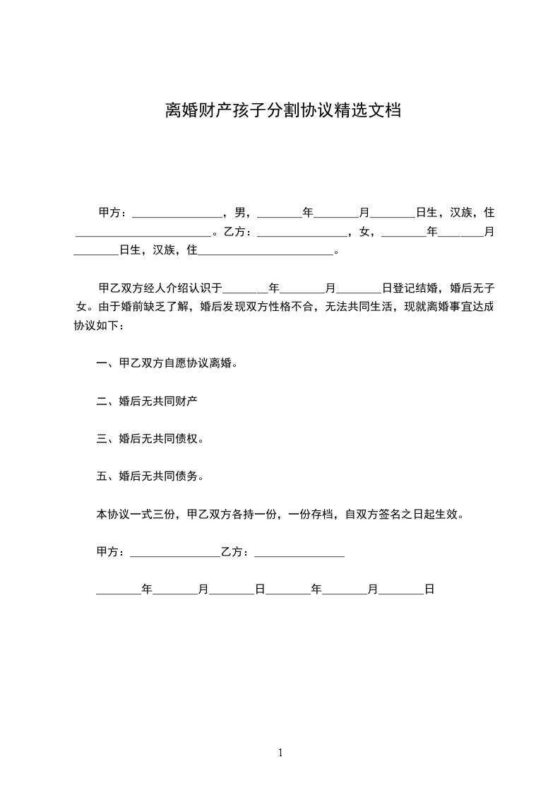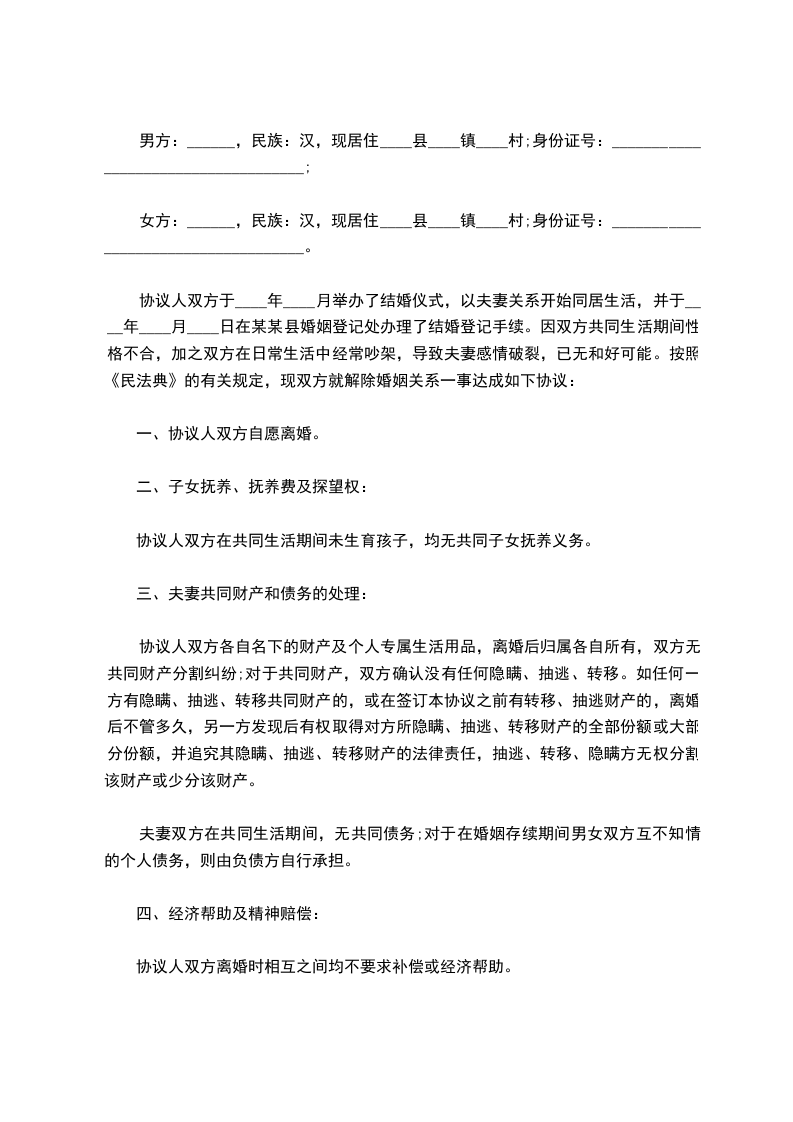 甲乙双方经人介绍认识于______________年________月_____________日 登记结婚,婚后无子女。由于婚前缺乏了解,婚后发现双方性格不合,无法共同生活,现就离婚事宜达成协议如下:
