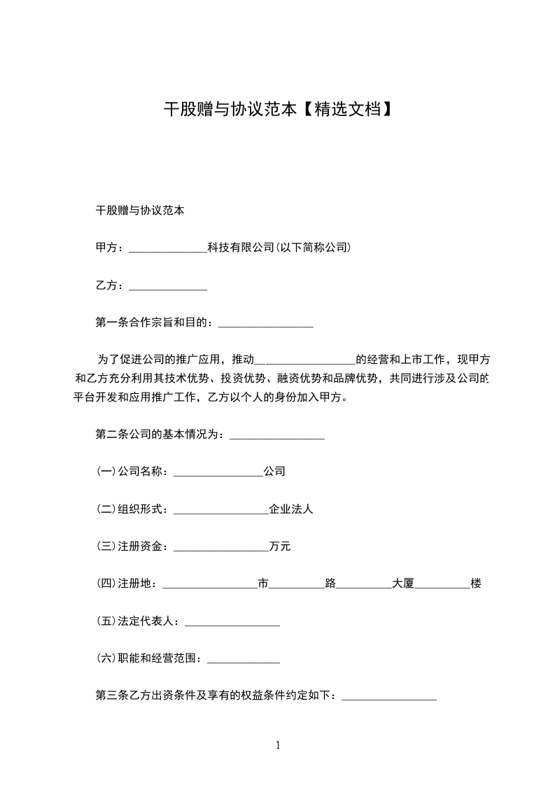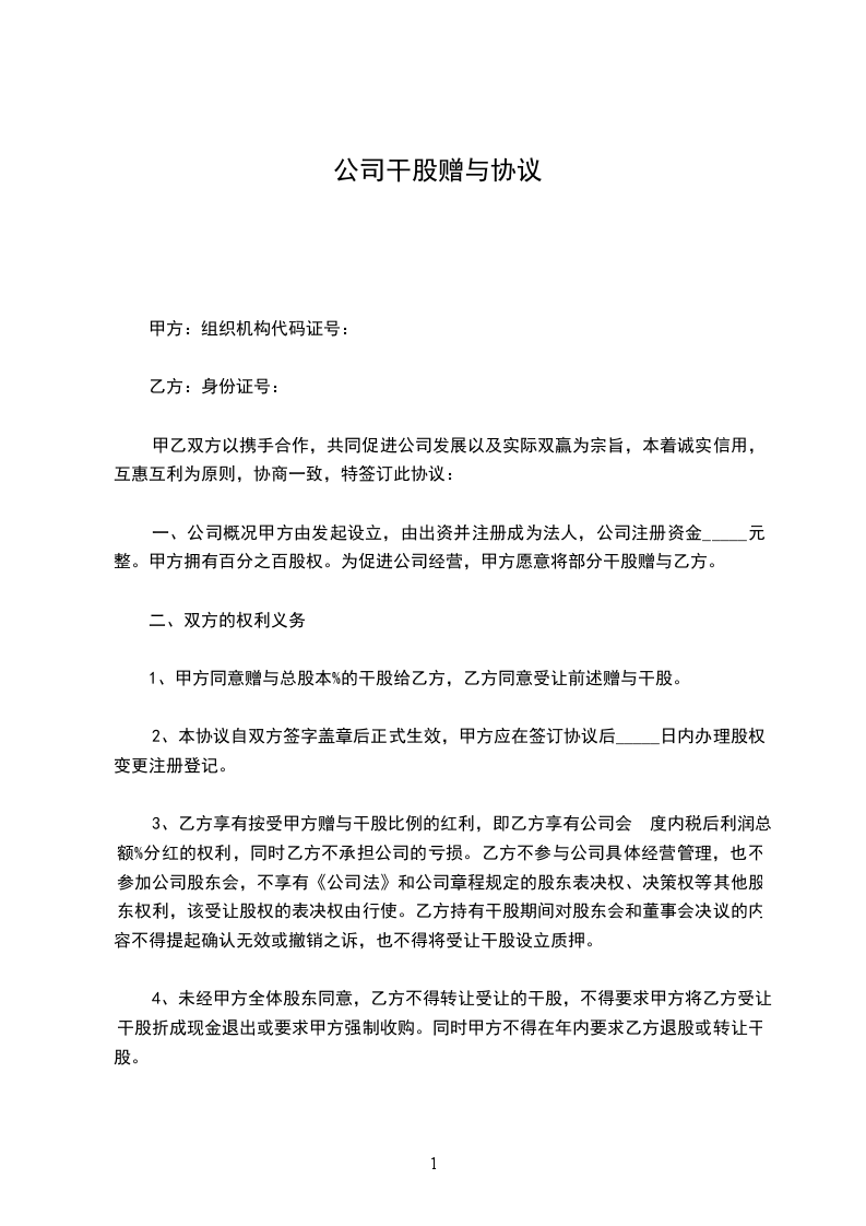 ___(以下简称“甲方”或“公司”)鉴于_________(以下简称“乙方”)对公司的贡献,以及为了激励乙方更好的工作,进一步提高公司经济效益和工作效率,甲方于_______________年____月_________日 召开服东会,决议向乙方以赠与干股的方式挤进行奖励和激励。为明确双方的权利与义务,特订立以下协议条款: