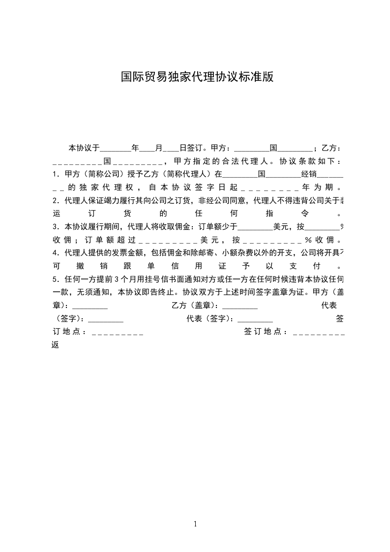 1.甲方(简称公司)授予乙方(简称代理人)在_________国_________经销_________的独家代理权,自本协议签字日起________年为期。