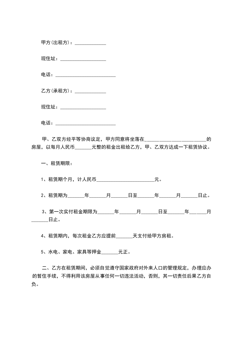 一、甲方将位于____市____街道____小区__号楼________号的房屋出租给乙方居住使用,租赁期限自____年____月____日至____年____月____日,计__个月。