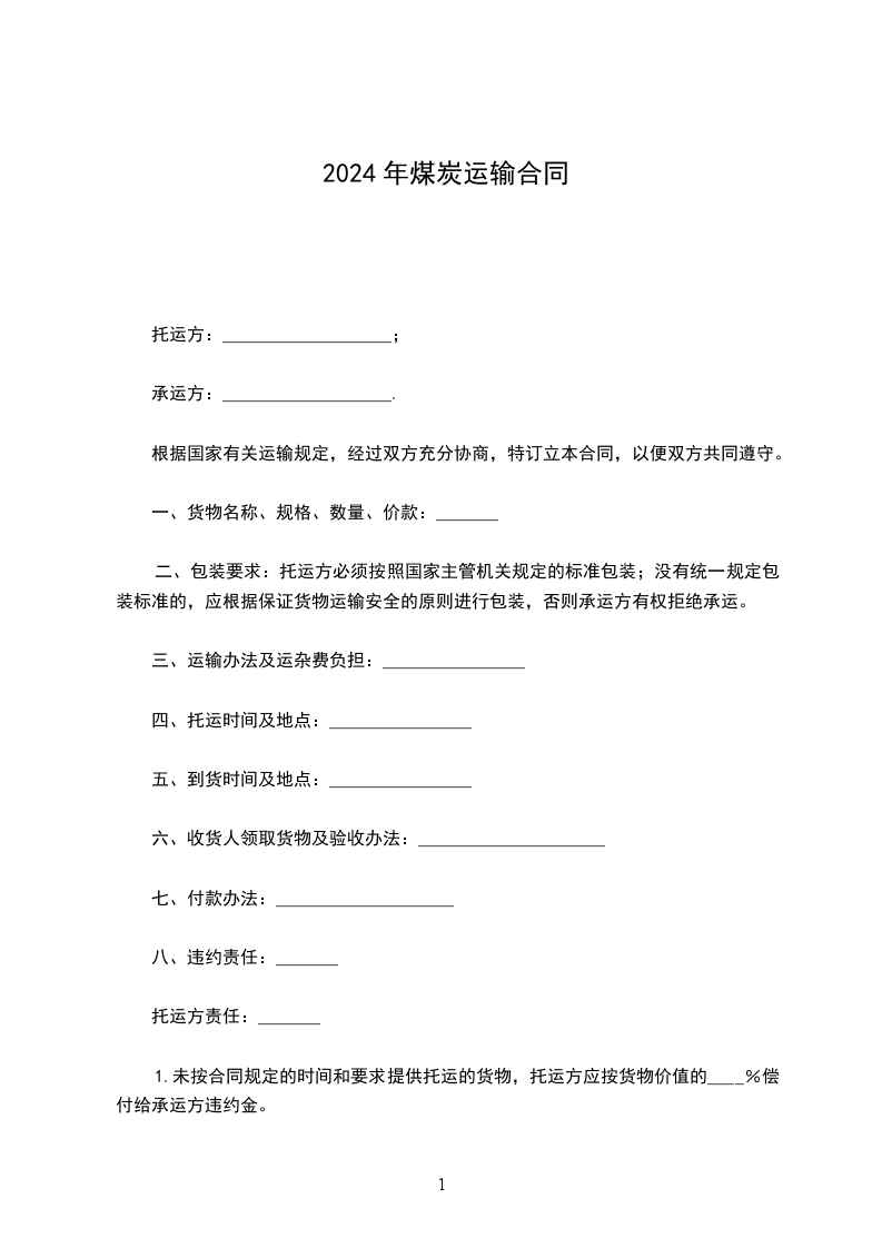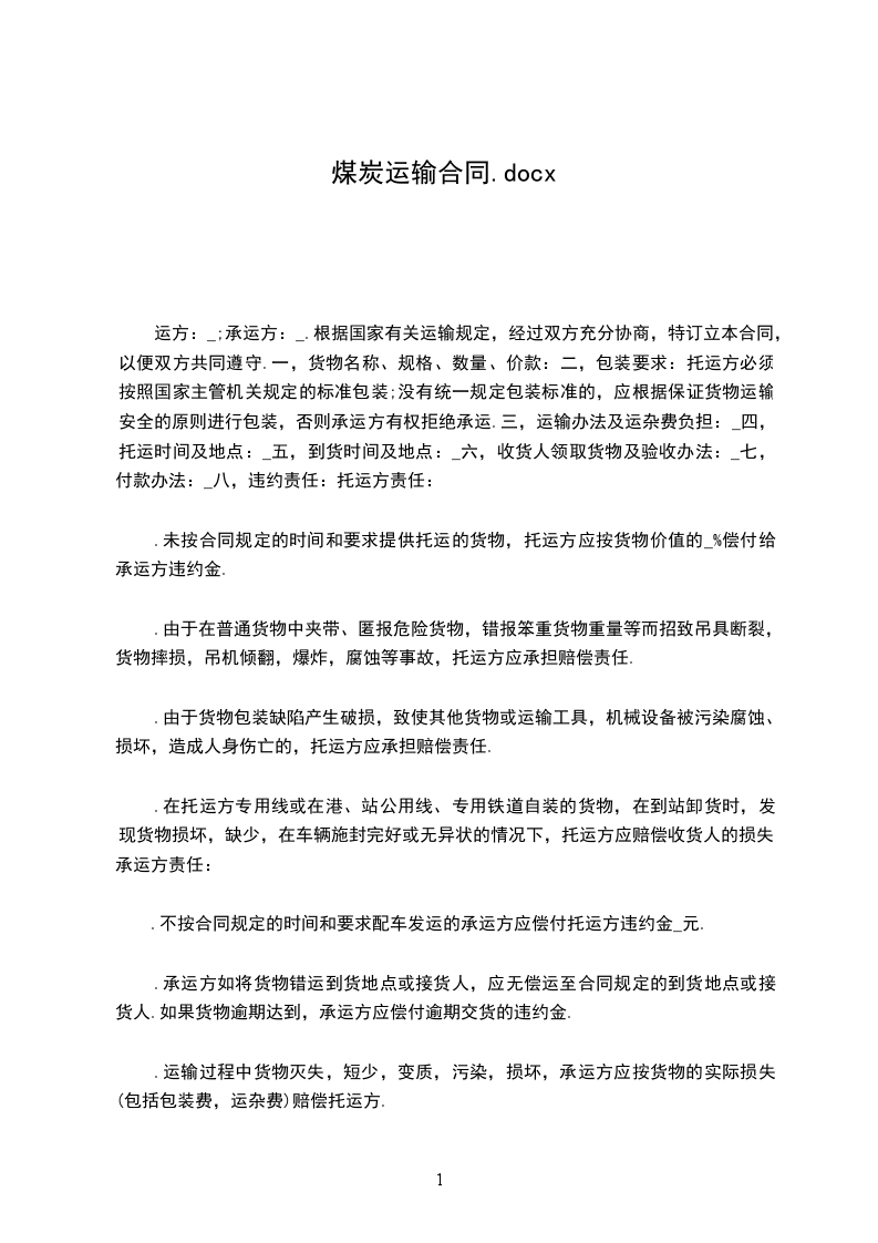 一、甲方委托乙方承运甲方位于____发往____的煤炭运输任务。