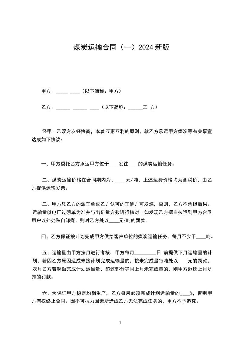 四、乙方保证按计划完成甲方供给客户单位的煤炭运输任务,每月不少于____吨。