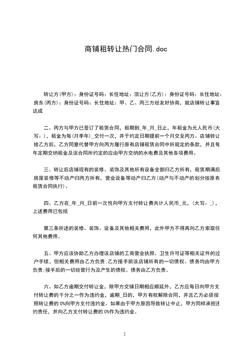 一、甲方将位于铺面的商铺(原为XXX)转让给乙方使用,原建筑面积约为平方米(改造后约为平方米),乙方享有原房屋租赁合同中有效期内的权利和义务,乙方转让费付清后,甲方协助乙方与房东办理房屋租赁合同的更变手续。