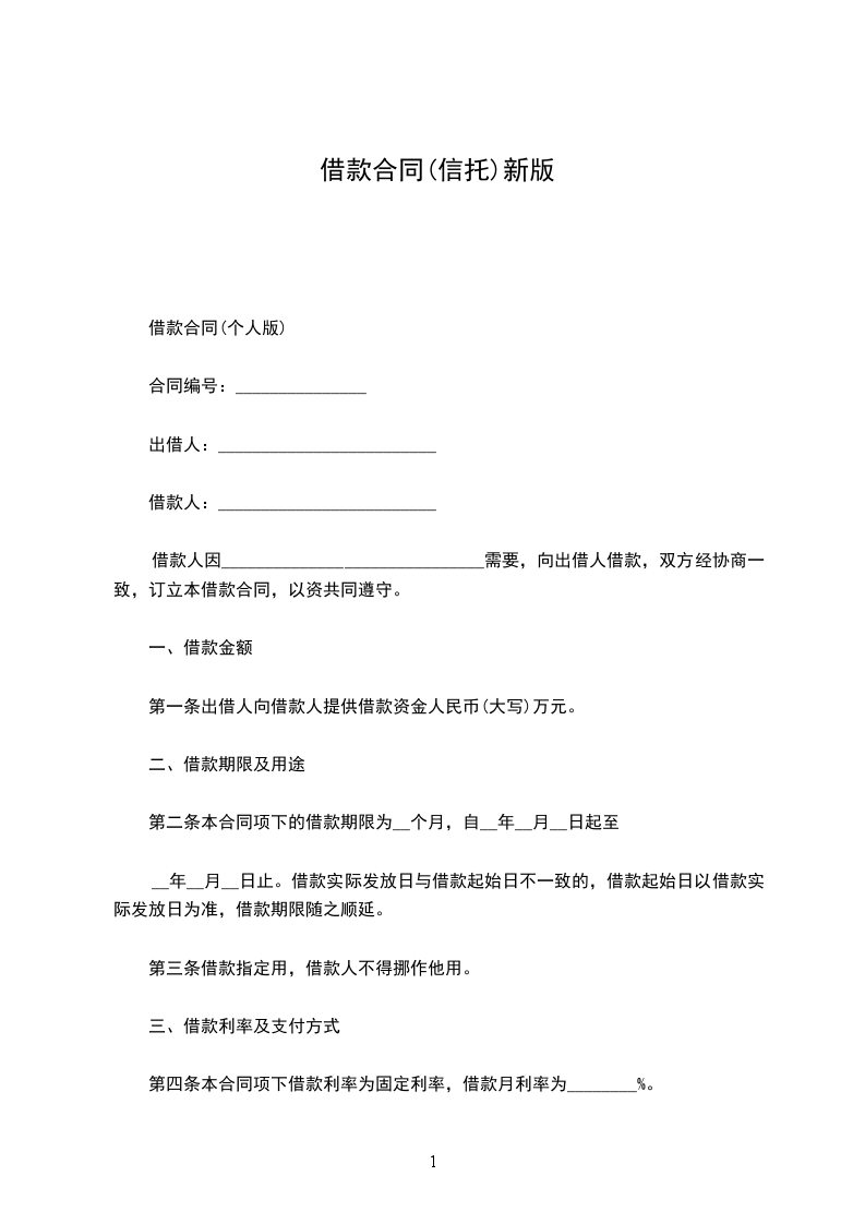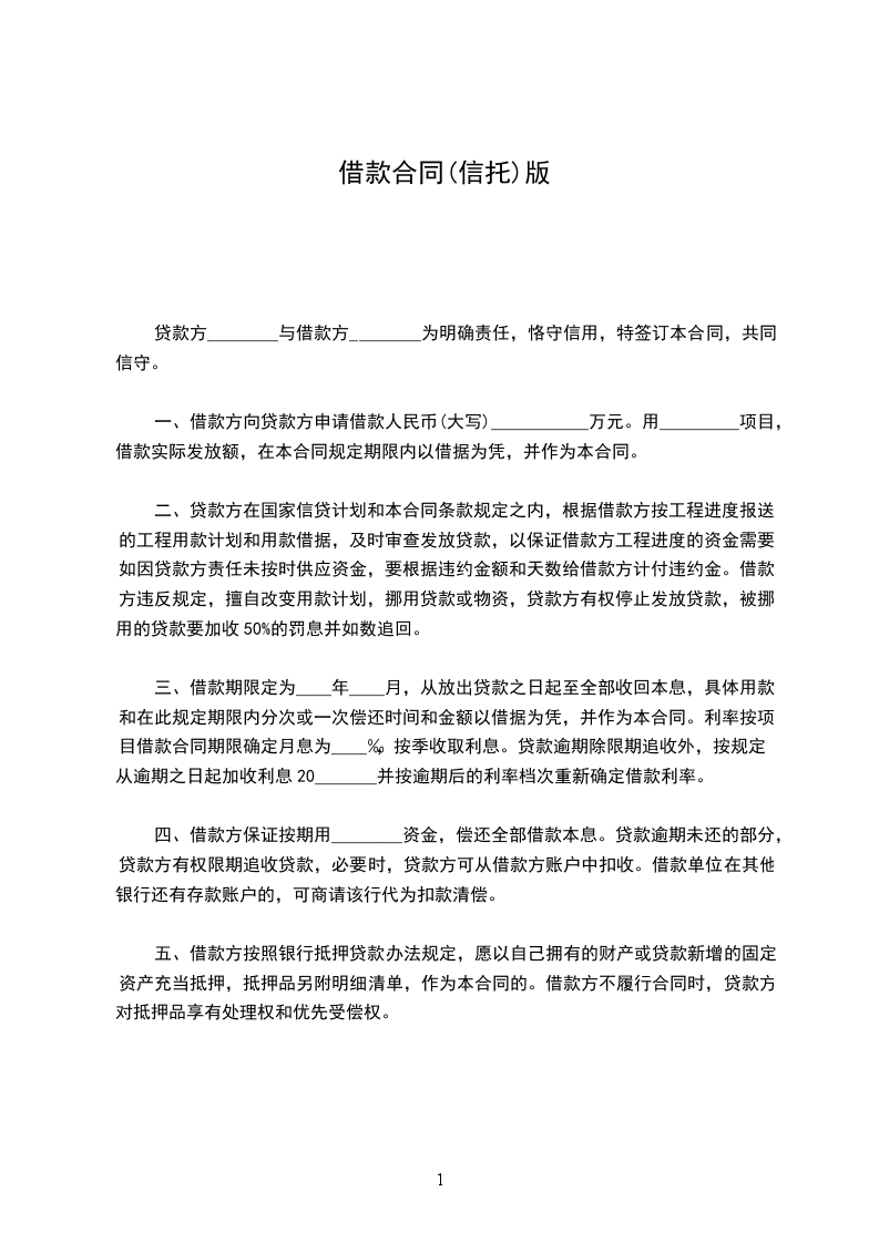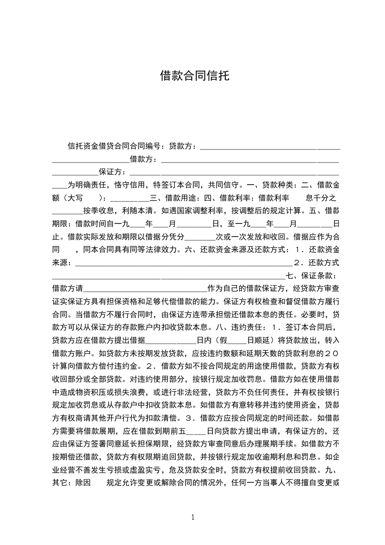 信托资金借贷合同合同编号:贷款方:____________________________借款方:_____________________________保证方:_____________________________为明确责任,恪守信用,特签订本合同,共同信守。一、贷款种类:二、借款金额(大写 ):__________三、借款用途:四、借款利率:借款利率 息千分之____按季收息,利随本清。如遇国家调整利率,按调整后的规定计算。五、借款期限:借款时间自一九__年__月_______日,至一九__年__月_______日止。借款实际发放和期限以借据分凭分____次或一次发放和收回。借据应作为合同 ,同本合同具有同等法律效力。六、还款资金来源及还款方式:1.还款资金来源:____________________________2.还款方式:______________________________七、保证条款:借款方请________________作为自己的借款保证方,经贷款方审查,证实保证方具有担保资格和足够代偿借款的能力。保证方有权检查和督促借款方履行合同。当借款方不履行合同时,由保证方连带承担偿还借款本息的责任。必要时,贷款方可以从保证方的存款账户内扣收贷款本息。八、违约责任:1.签订本合同后,贷款方应在借款方提出借据_________日内(假_____日顺延)将贷款放出,转入借款方账户。如贷款方未按期发放贷款,应按违约数额和延期天数的贷款利息的20%计算向借款方偿付违约金。2.借款方如不按合同规定的用途使用借款,贷款方有权收回部分或全部贷款。对违约使用部分,按银行规定加收罚息。借款方如在使用借款中造成物资积压或损失浪费,或进行非法经营,贷款方不负任何责任,并有权按银行规定加收罚息或从存款户中扣收贷款本息。如借款方有意转移并违约使用资金,贷款方有权商请其他开户行代为扣款清偿。3.借款方应按合同规定的时间还款。如借款方需要将借款展期,应在借款到期前五_____日向贷款方提出申请,有保证方的,还应由保证方签署同意延长担保期限,经贷款方审查同意后办理展期手续。如借款方不按期偿还借款,贷款方有权限期追回贷款,并按银行规定加收逾期利息和罚息。如企业经营不善发生亏损或虚盈实亏,危及贷款安全时,贷款方有权提前收回贷款。九、其它:除因 规定允许变更或解除合同的情况外,任何一方当事人不得擅自变更或解除合同。当事人一方依据 要求变更或解除合同时,应及时采用书面形式通知其他当事人,并达成书面协议。本合同变更或解除后,借款方占用的借款和应付的利息,仍应按本合同的规定偿付。双方协议的附加条款。(争议解决方式等)合同的 :本合同经各方签字后生效,贷款本息全部清偿后自动失效。本合同正本一式三份。贷款方、借款方、保证方各执一份;合同副本____份,报送______有关单位各留存一份。贷款方 :_____(公章)借款方 :_____(公章)法人代表 :_____(盖章)法人代表 :_____(盖章)保证方:(公章)法人代表 :_____(盖章)借款方开户银行和 帐号:_____签约 _____日期:____签约 地址:_____