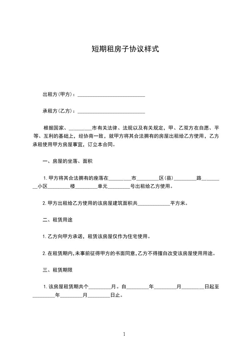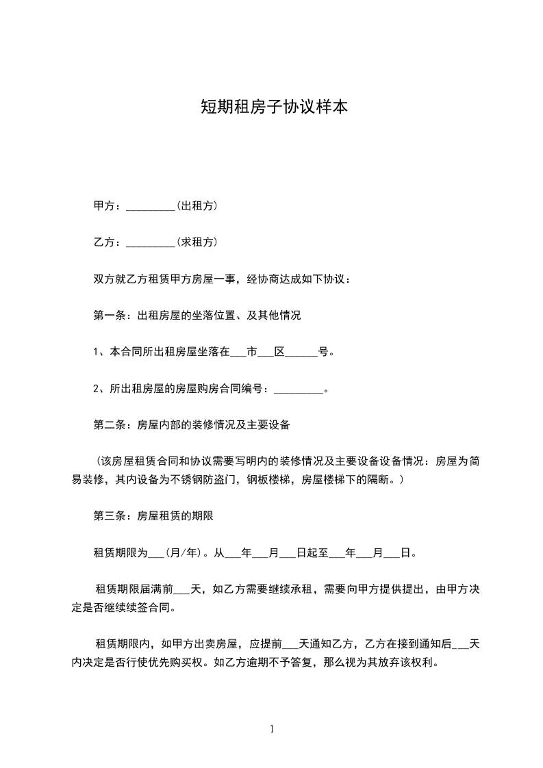 经双方协商甲方将位于____________市____________________________房屋出租给乙方居住使用。