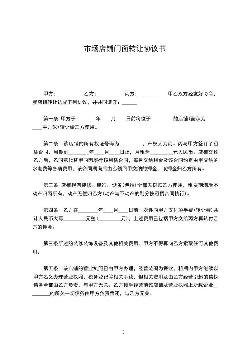 一、 转让标的:甲方愿将独资设立,坐落 市路号的兴国XX,转让予乙方经营。