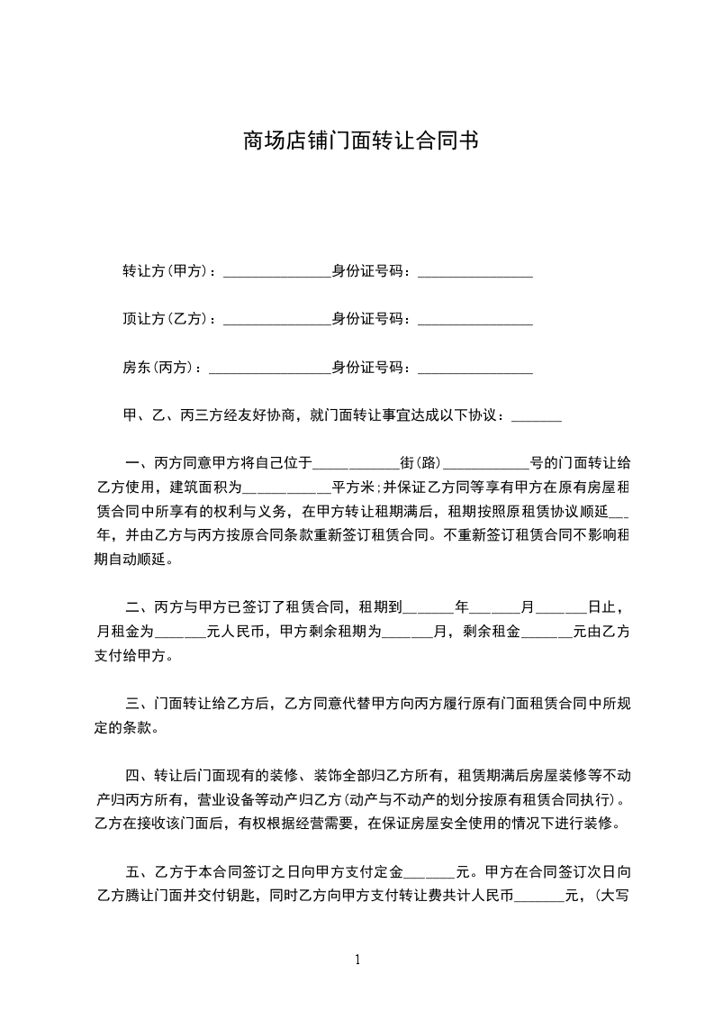 (三) 商号现承租坐落 市路号的租赁权,由甲方让与乙方,并由甲方负责出租人与乙方办理续租年,与乙方另行换立租约,如出租人不允许续租或要求增加租金或提出其他条件,致乙方受害时,甲方应负赔偿责任。