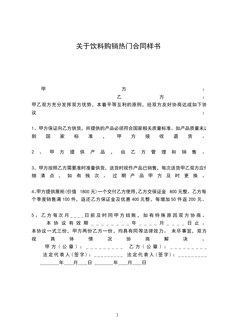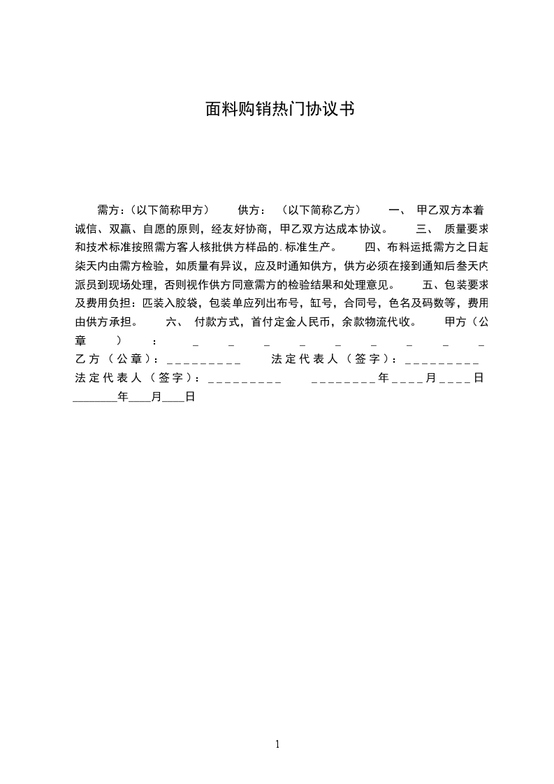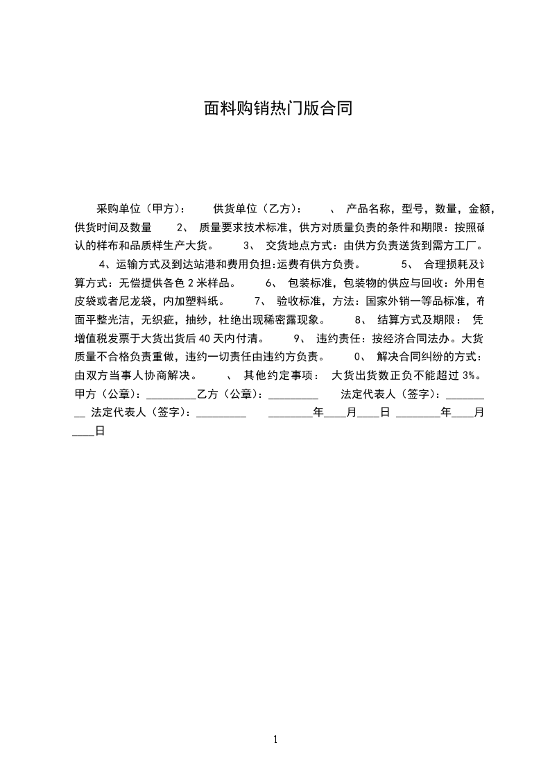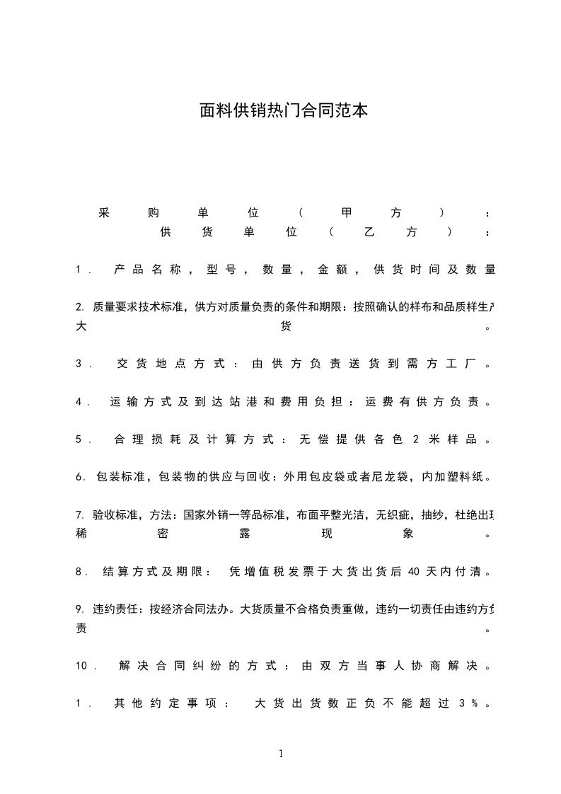 采购单位(甲方): 供货单位(乙方): 、 产品名称,型号,数量,金额,供货时间及数量 2、 质量要求技术标准,供方对质量负责的条件和期限:按照确认的样布和品质样生产大货。 3、 交货地点方式:由供方负责送货到需方工厂。 4、 运输方式及到达站港和费用负担:运费有供方负责。 5、 合理损耗及计算方式:无偿提供各色2米样品。 6、 包装标准,包装物的供应与回收:外用包皮袋或者尼龙袋,内加塑料纸。 7、 验收标准,方法:国家外销一等品标准,布面平整光洁,无织疵,抽纱,杜绝出现稀密露现象。 8、 结算方式及期限: 凭增值税发票于大货出货后40天内付清。 9、 违约责任:按经济合同法办。大货质量不合格负责重做,违约一切责任由违约方负责。 0、 解决合同纠纷的方式:由双方当事人协商解决。 、 其他约定事项: 大货出货数正负不能超过3%。 甲方(公章):_________乙方(公章):_________ 法定代表人(签字):_________ 法定代表人(签字):_________ ________年____月____日 ________年____月____日