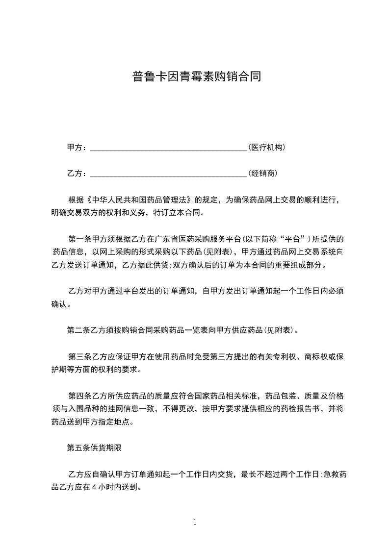 第一条甲方须根据乙方在广东省医药采购服务平台(以下简称“平台”)所提供的药品信息,以网上采购的形式采购以下药品(见附表),甲方通过药品网上交易系统向乙方发送订单通知,乙方据此供货;双方确认后的订单为本合同的重要组成部分。