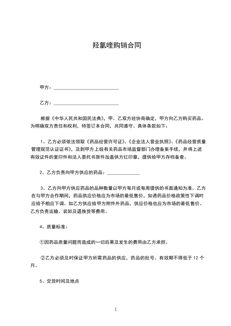 根据《中华人民共和国民法典》,甲、乙双方经协商确定,甲方向乙方购买药品。为明确双方责任和权利,特签订本合同,共同遵守。具体条款如下: