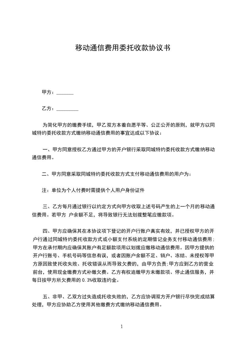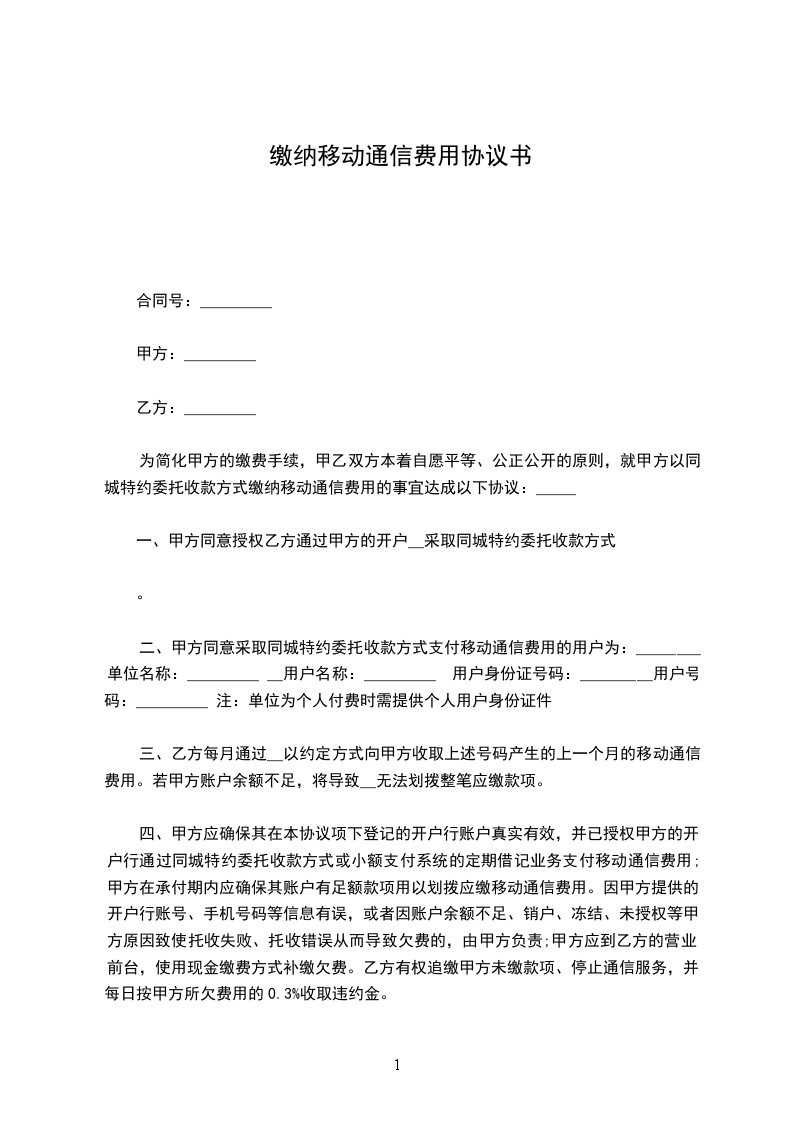 合同号:_________甲方:_________乙方:_________为简化甲方的缴费手续,甲乙双方本着自愿平等、公正公开的原则,就甲方以同城特约委托收款方式缴纳移动通信费用的事宜达成以下协议: